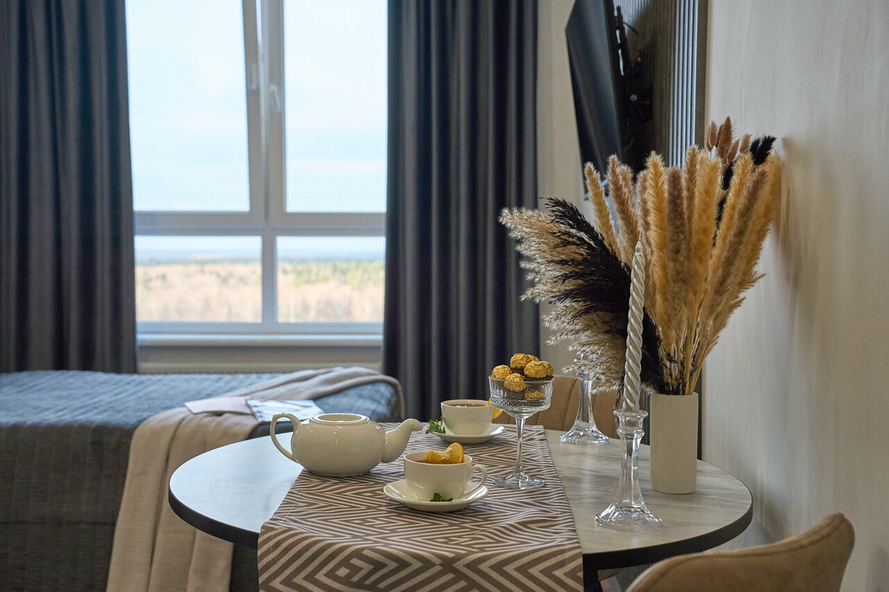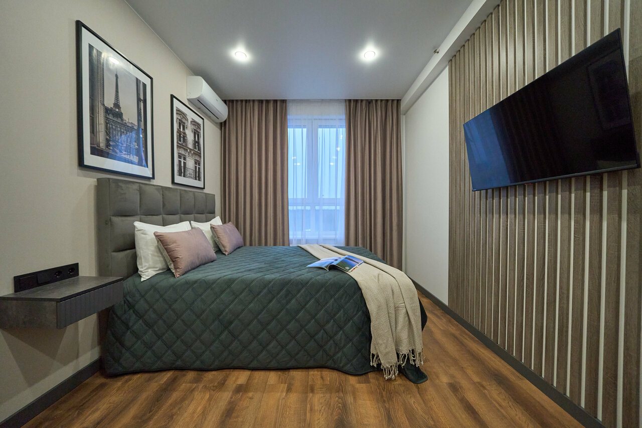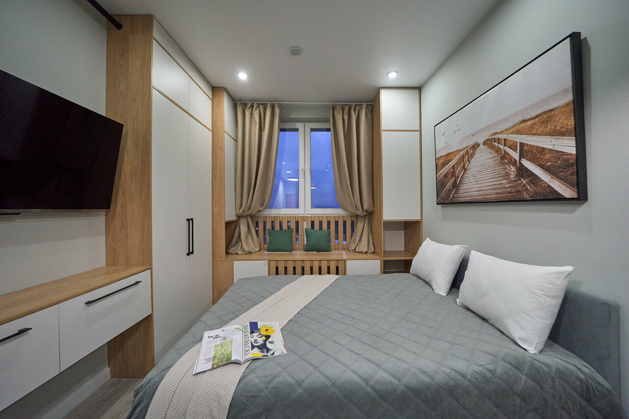 ЛЮКС С БОЛЬШОЙ КРОВАТЬЮ И КУХНЕЙ площадью 24 кв. располагает всем необходимым для комфортного проживания 1-2 человек. Дизайн и мебель апартаментов выполнены в светлой цветовой гамме и современном стиле.