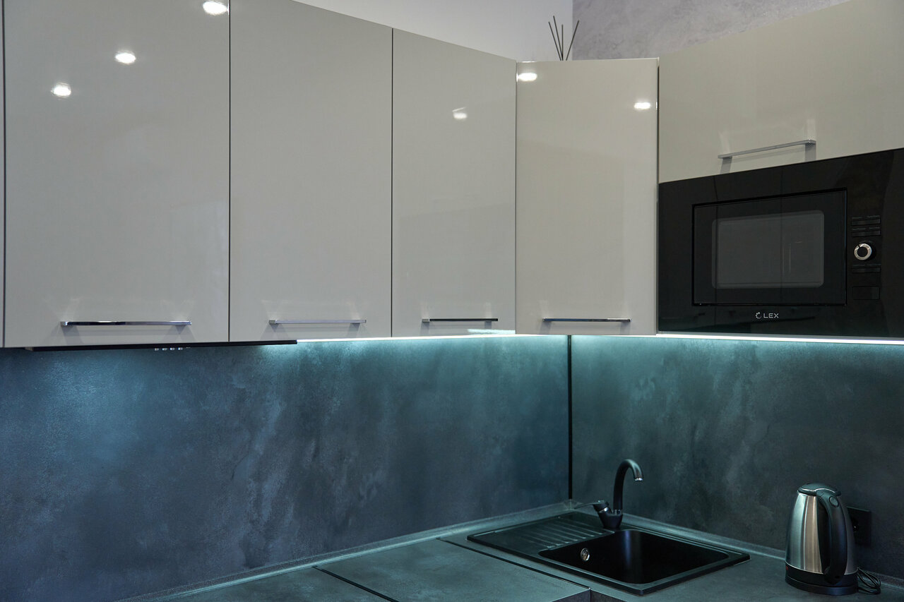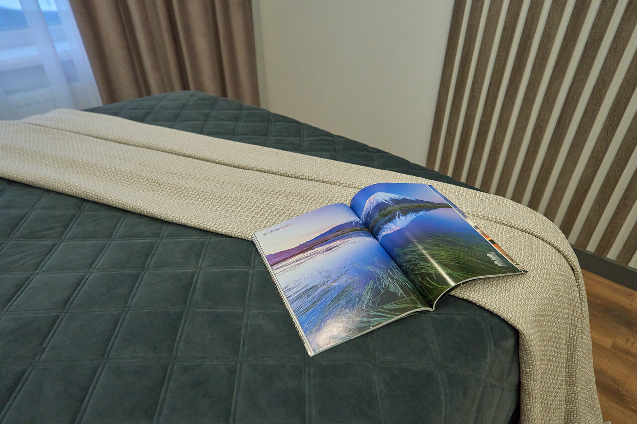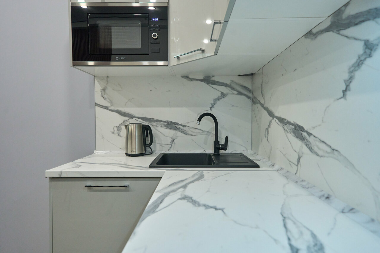 ЛЮКС С БОЛЬШОЙ КРОВАТЬЮ И КУХНЕЙ площадью 24 кв. располагает всем необходимым для комфортного проживания 1-2 человек. Дизайн и мебель апартаментов выполнены в светлой цветовой гамме и современном стиле.