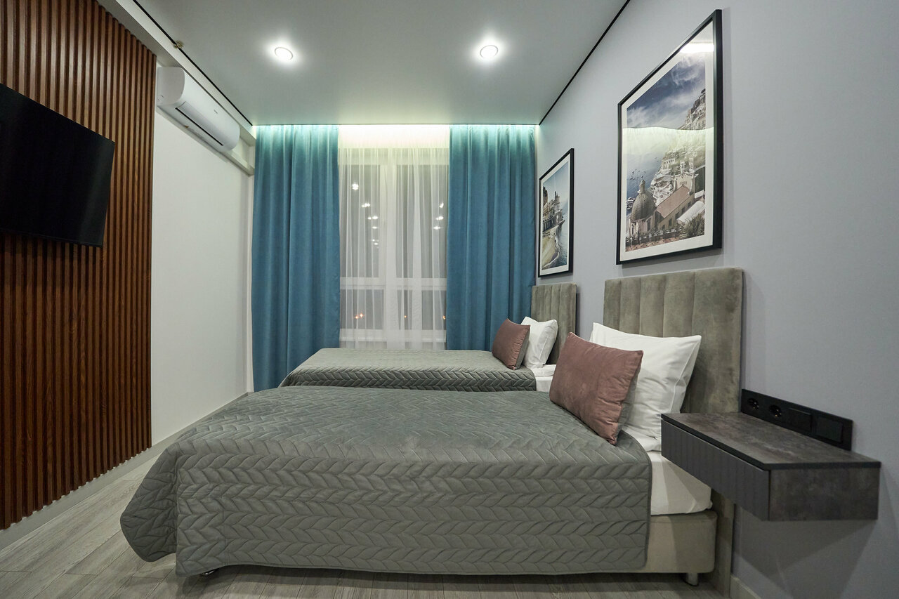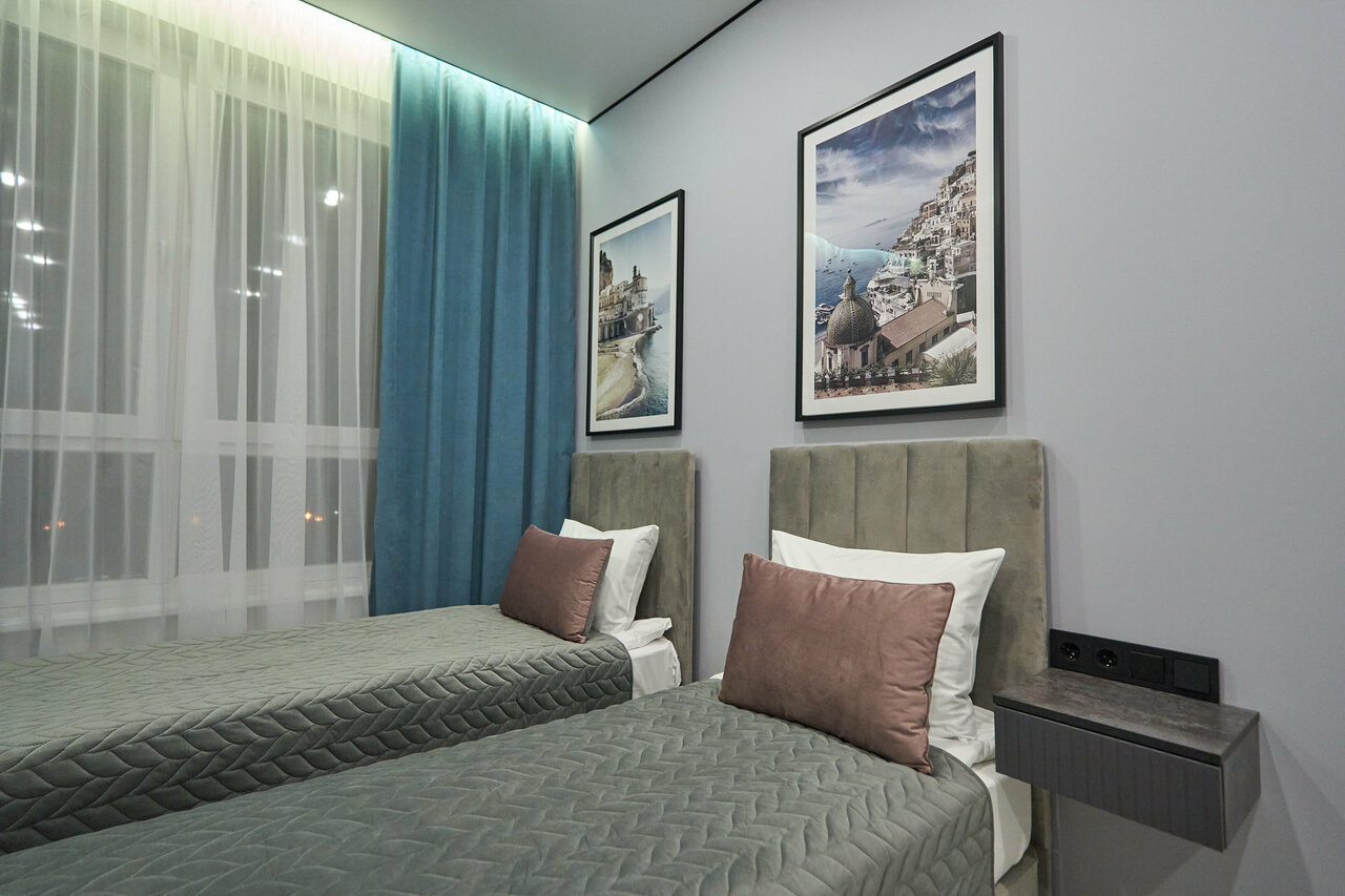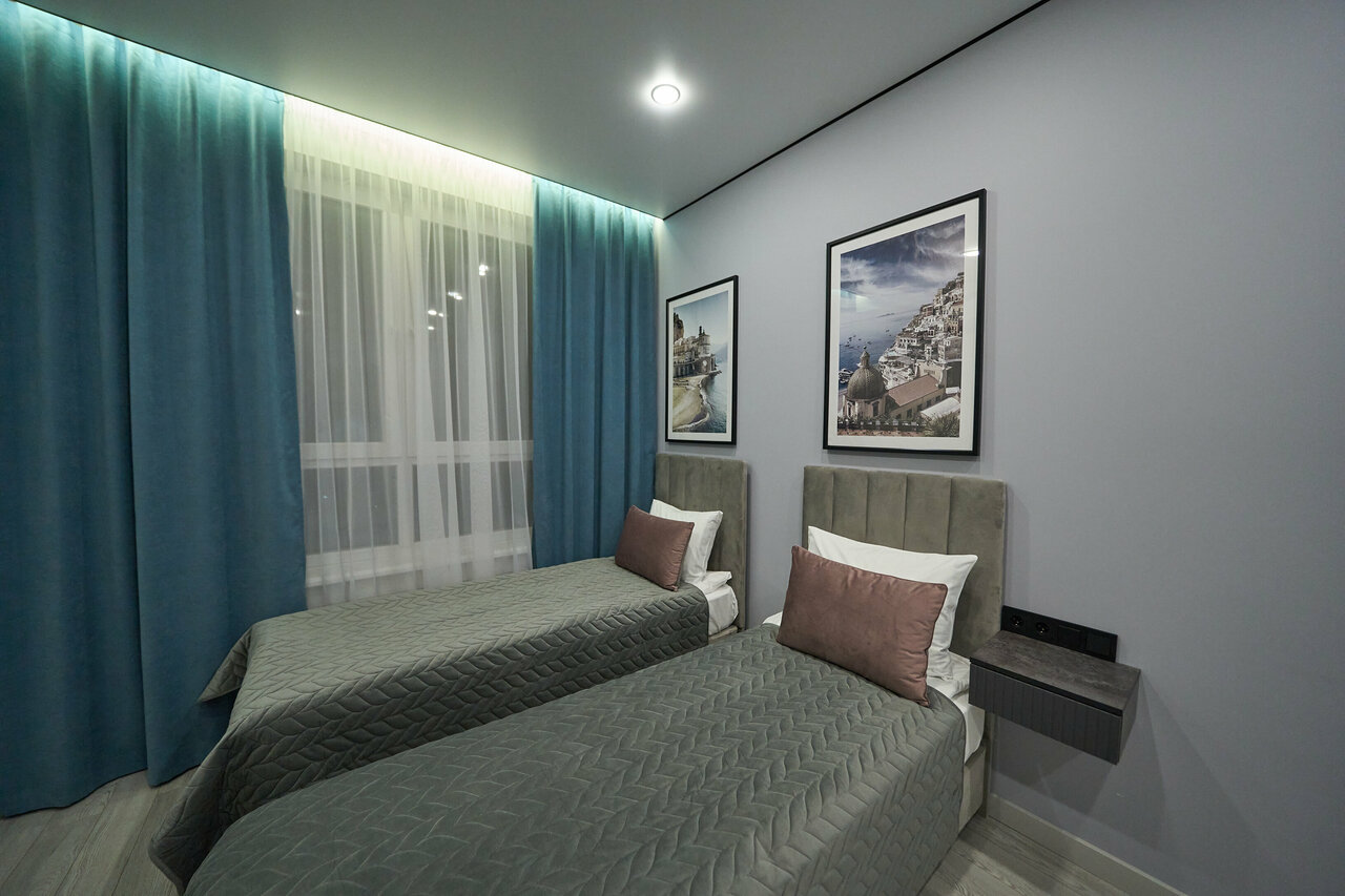 СТАНДАРТ С ДВУМЯ РАЗДЕЛЬНЫМИ КРОВАТЯМИ И КУХНЕЙ площадью 24 кв. м., располагает всем необходимым для комфортного проживания 1-2 человек. Дизайн и мебель апартаментов выполнены в светлой цветовой гамме и современном стиле. Апартаменты доступны дл...