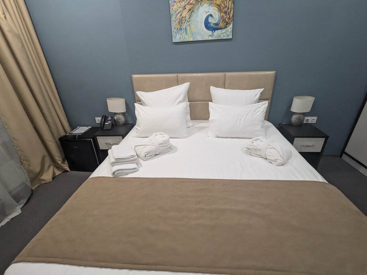 Номера хорошие, куча полотенец, мыльный набор, вода. Завтрак за отдельную плату, 1000 рублей. Небольшая стоянка, в пешей доступности магазины. Район тихий, спокойный.