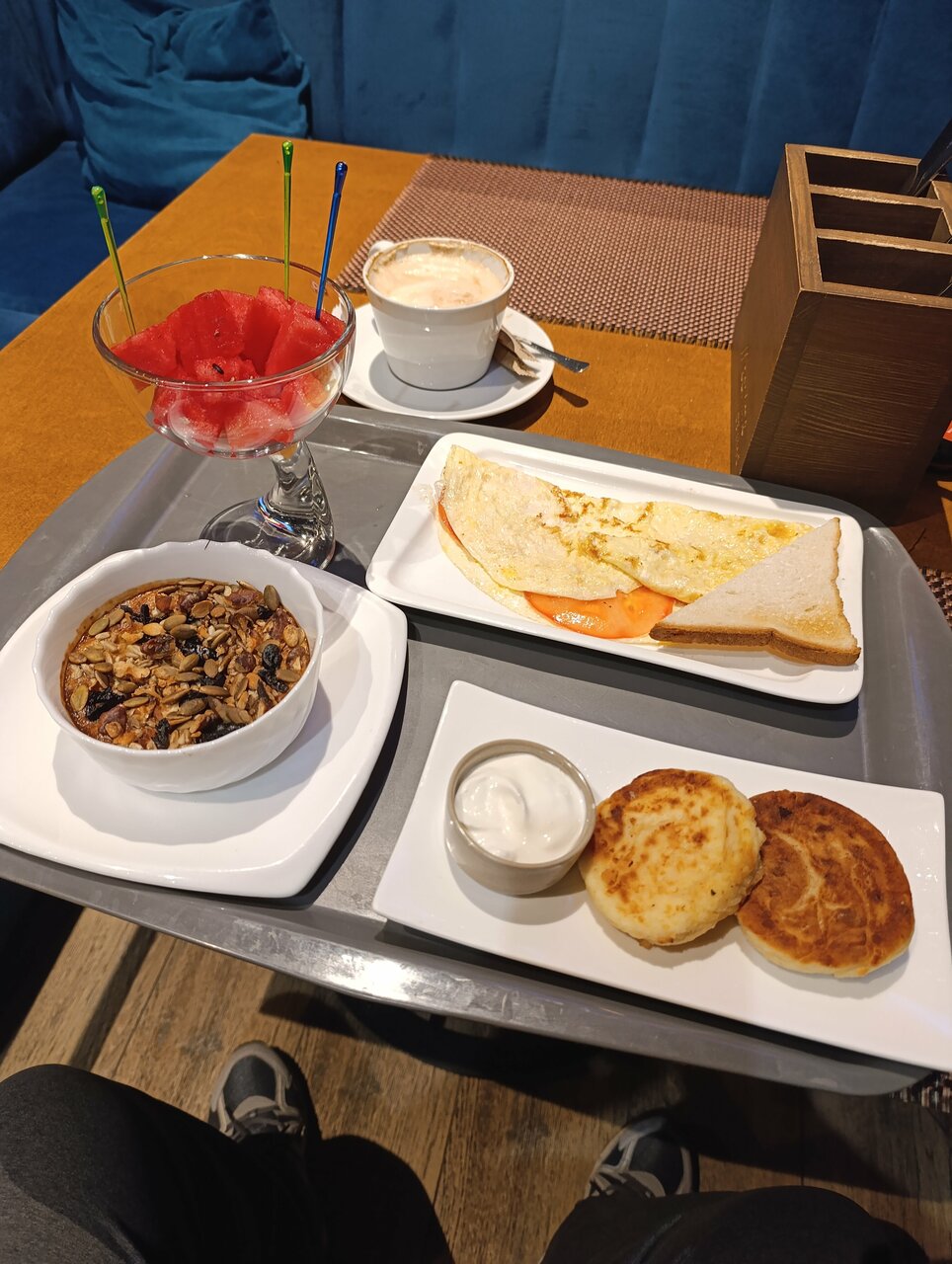 Бутик Отель Евразия предлагает гостям вкусный и сытный завтрак шведский стол с 08.00 до 11.00 утра. В меню всегда свежие горячие блюда: каша, творожная запеканка, сосиски, овощи, холодные закуски, йогурт, чай, кофе, свежая выпечка.
