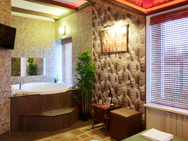 - Стерильная чистота.; Бонусы в некоторых номерах.; Просторные и зеркальные номера.; Хорошее обслуживание.; Наличие бани и чана на дровах.