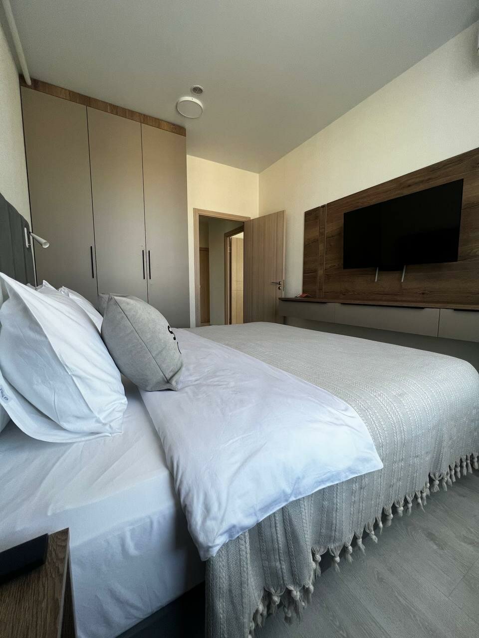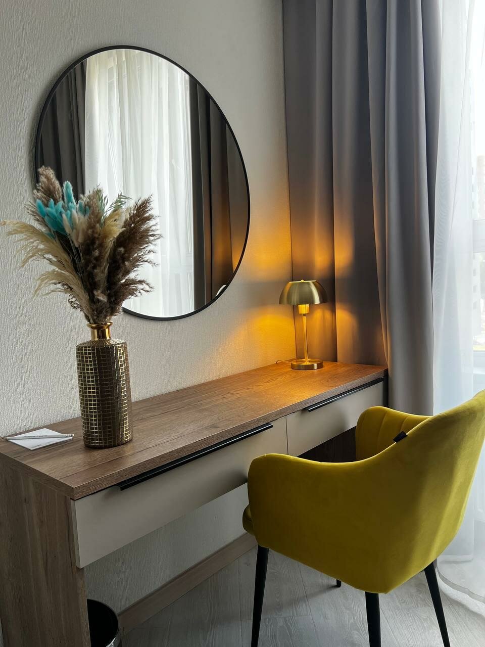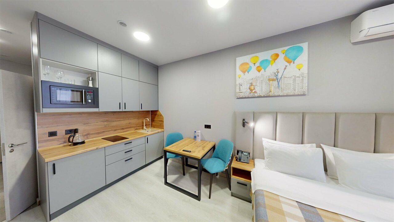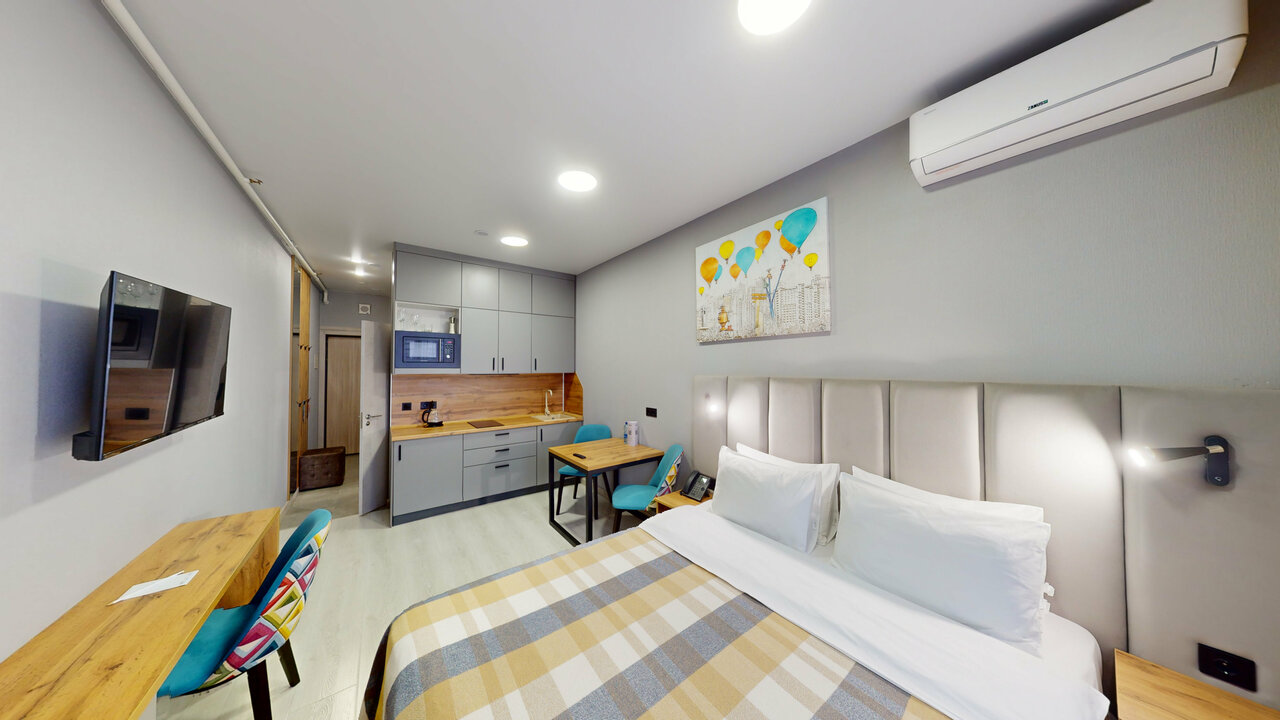 В номере предусмотрено полноценное спальное место, кухня с обеденной зоной, где гости могут приготовить свои любимые блюда. Стильный лаконичный интерьер и современная обстановка создают приятную атмосферу для отдыха и работы.