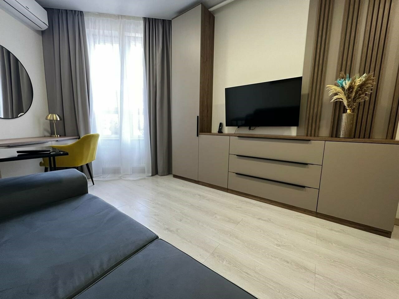 Студия – это номер, площадью 23 кв.м., жилое пространство которого разделено на две зоны – кухню-гостиную и спальню с двуспальным диваном. Просторный и светлый номер порадует даже самого разборчивого гостя.