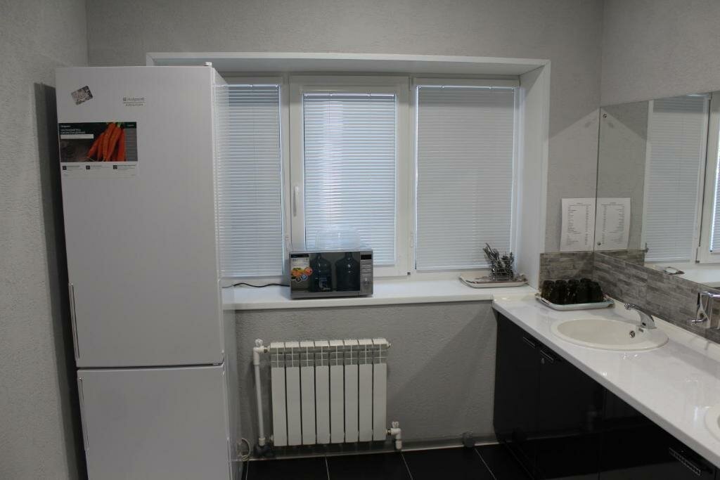 - Наличие кухни с холодильником, микроволновкой, плитой и посудой.