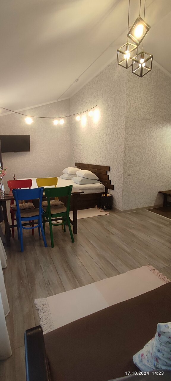 Комфортный, просторный номер, с большой кроватью 2х2, раскладным диваном, огромными окнами, санузел с банными и косметическими принадлежностями, кухня, холодильник, микроволновая печь, сплит-система.