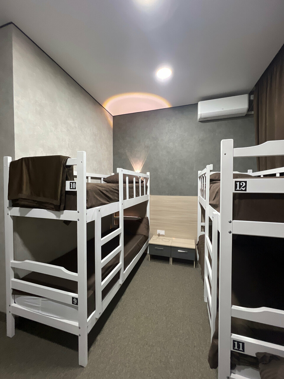 Двухкомнатный номер - 2 комнаты по 2-3 чел.Санузел один на две комнаты на одном балконе.Сдаются одним блоком(этаж), как двухкомнатный номер. В комнатах чайник,посуда,холодильник, ТВ,кондиционер. Есть общая кухня со стиральной машиной.
