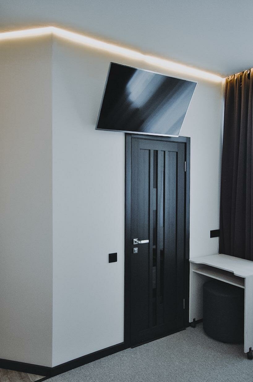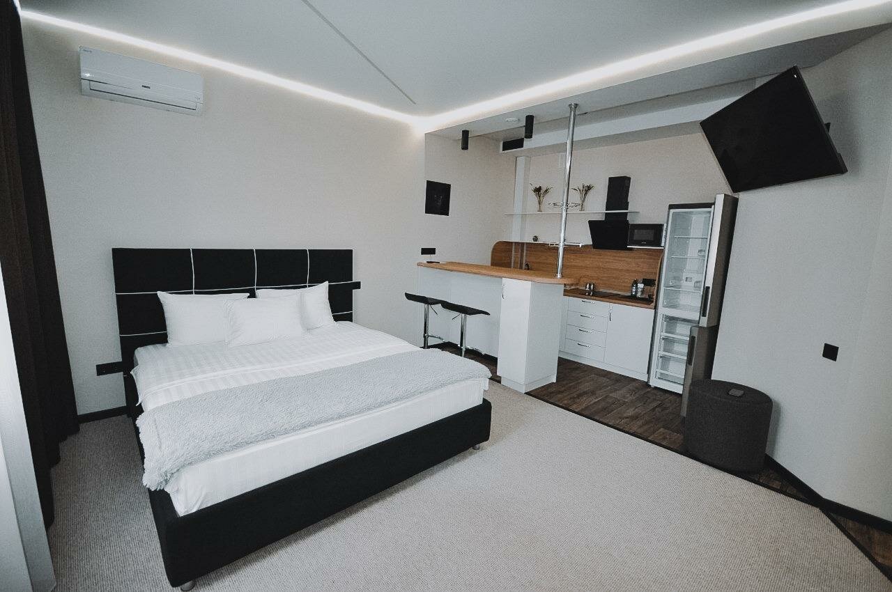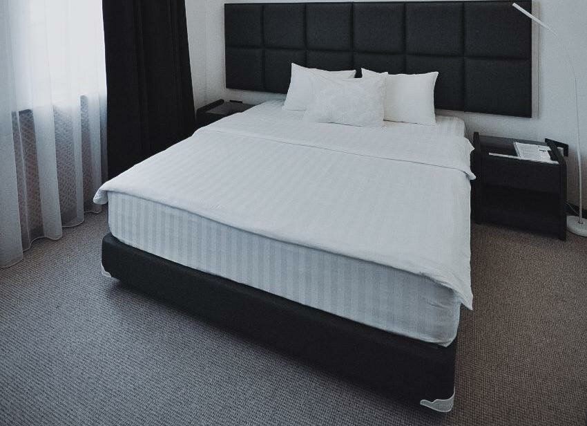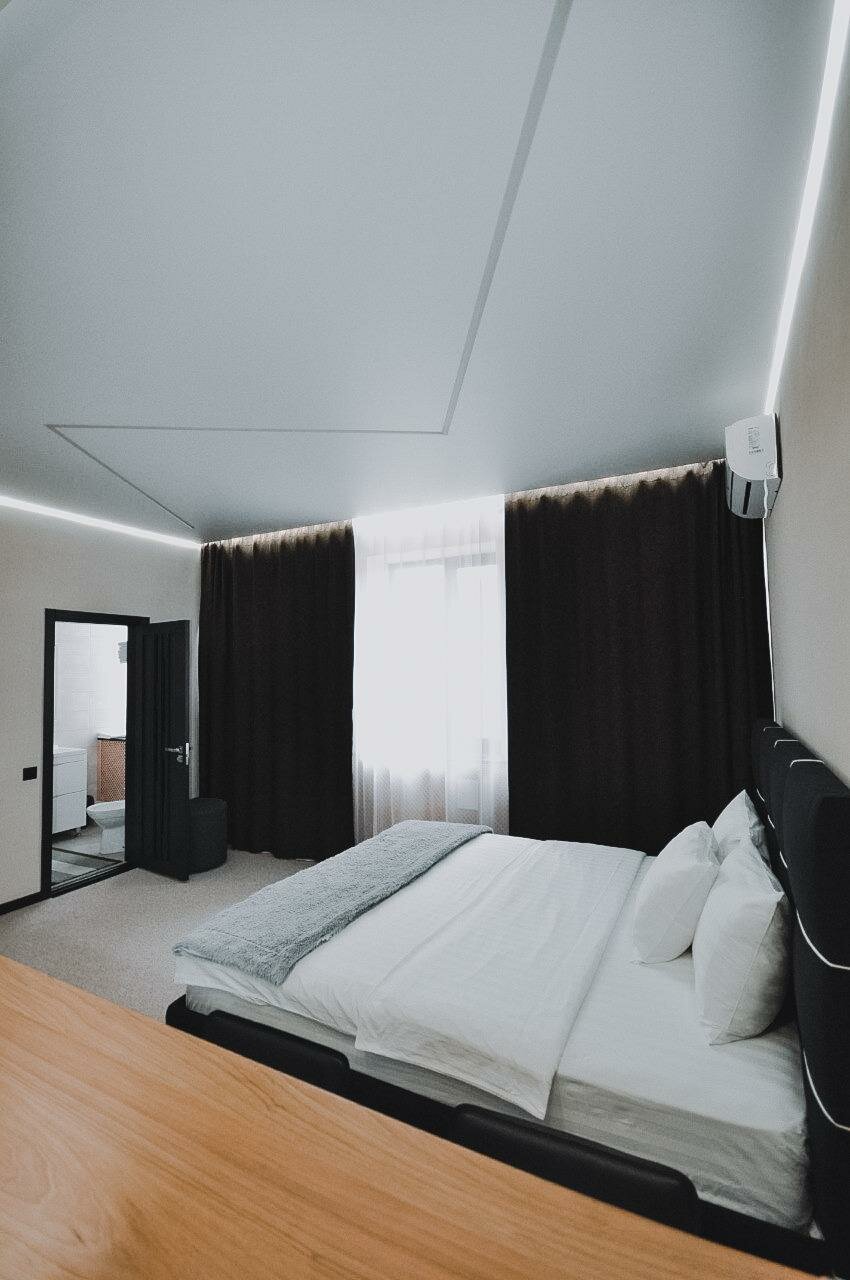 Просторный номер с большой двуспальной кроватью и ортопедическим матрасом премиум класса. Бесшумная Сплит-система, плазменныйТВ, Кухня: барная стойка, электрический чайник, холодильник, СВЧ-печь, Электроплита, вся необходимая посуда.