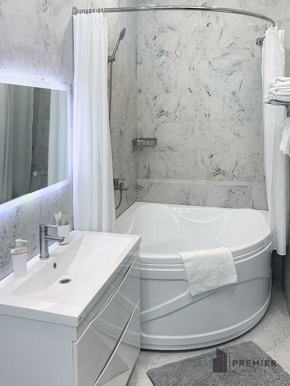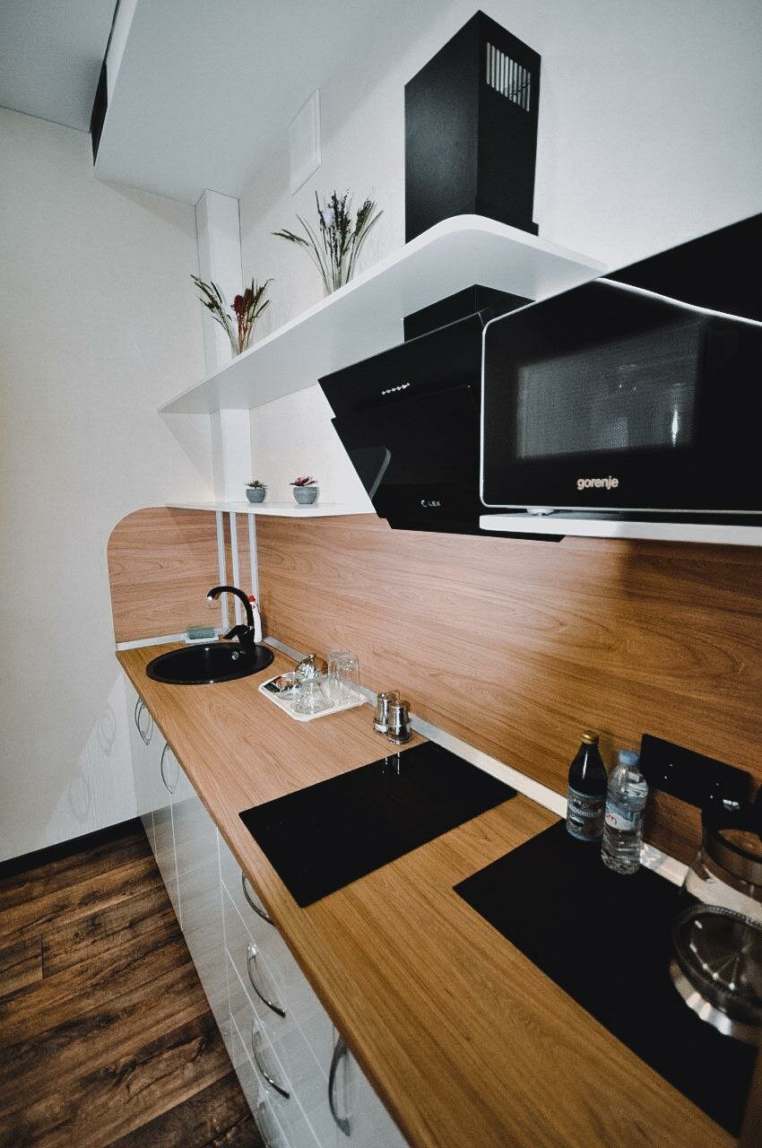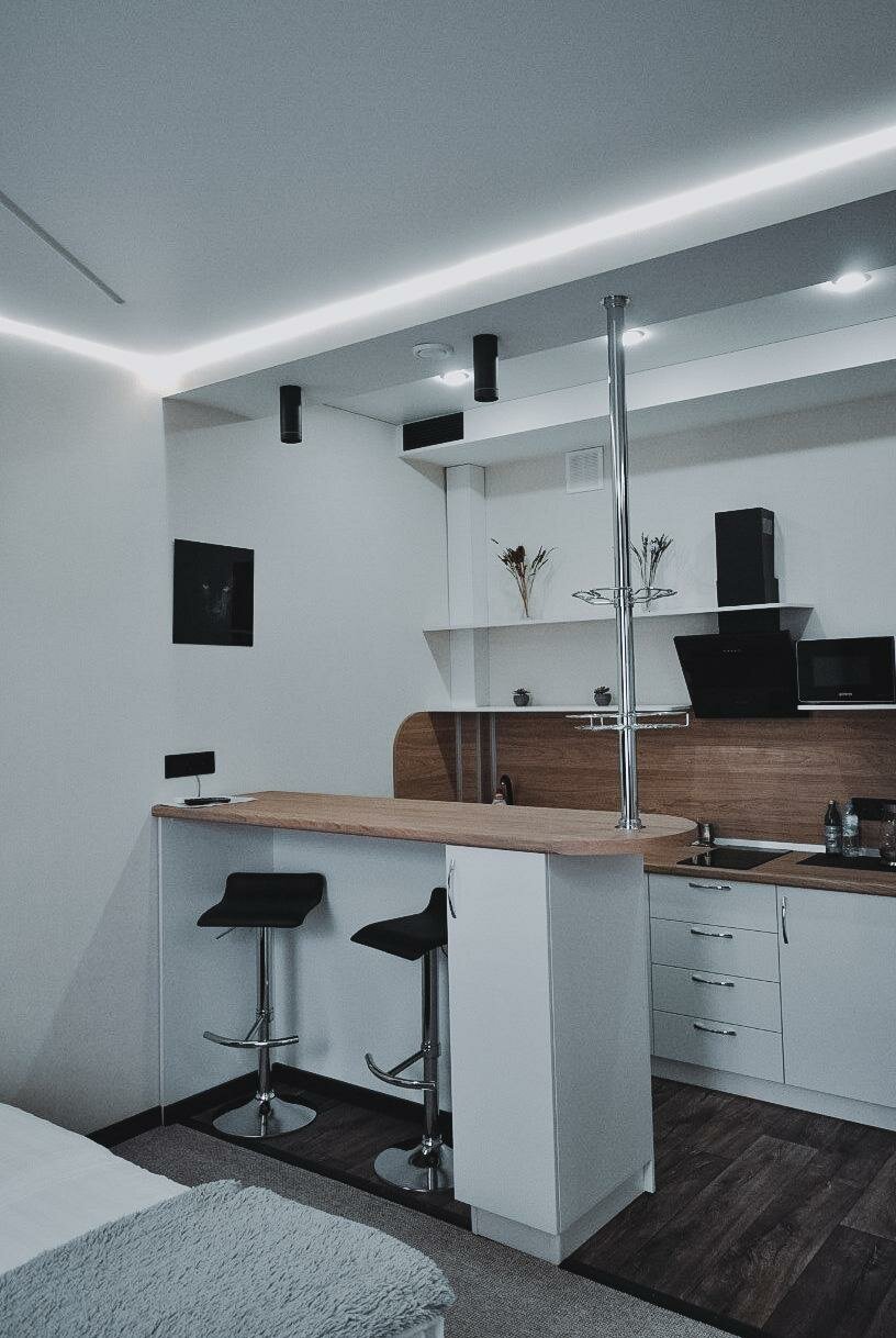 Просторный номер с большой двуспальной кроватью, ортопедическим матрасом премиум класса и угловым диваном. Бесшумная Сплит-система, плазменныйТВ, Кухня: барная стойка, электрический чайник, холодильник, СВЧ-печь, Электроплита, вся необходимая посуда.