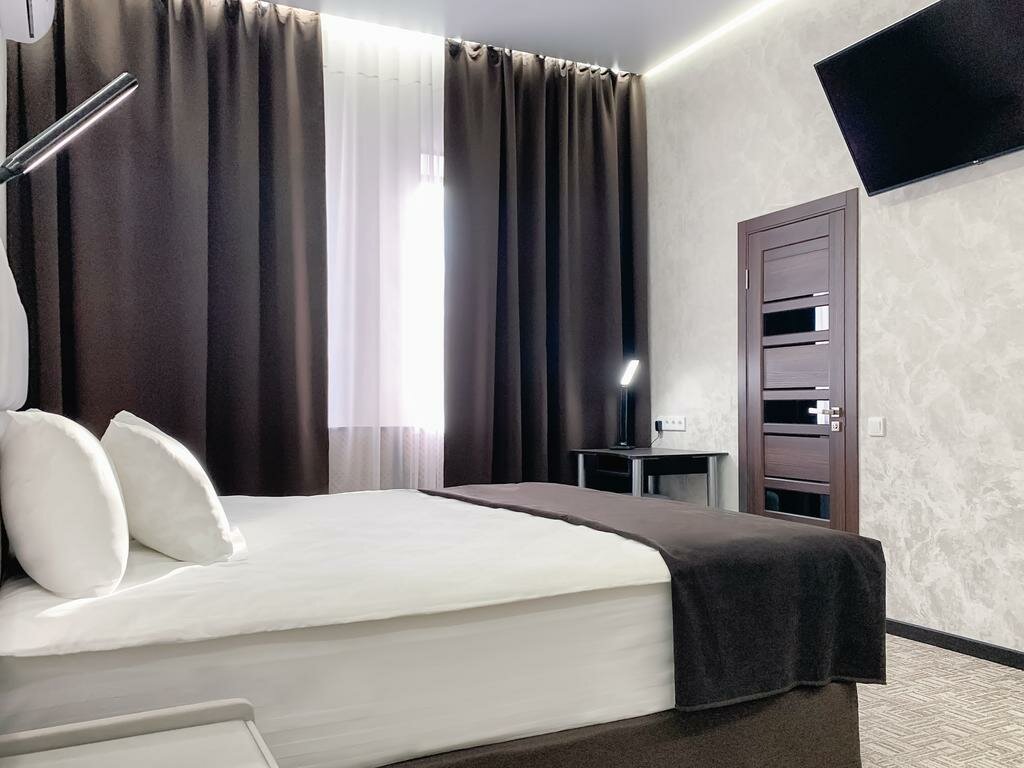 Номер с двуспальной кроватью и ортопедическим матрасом. Бесшумная Сплит-система (инвертор), плазменный телевизор, холодильник, чайник, одноразовые принадлежности.