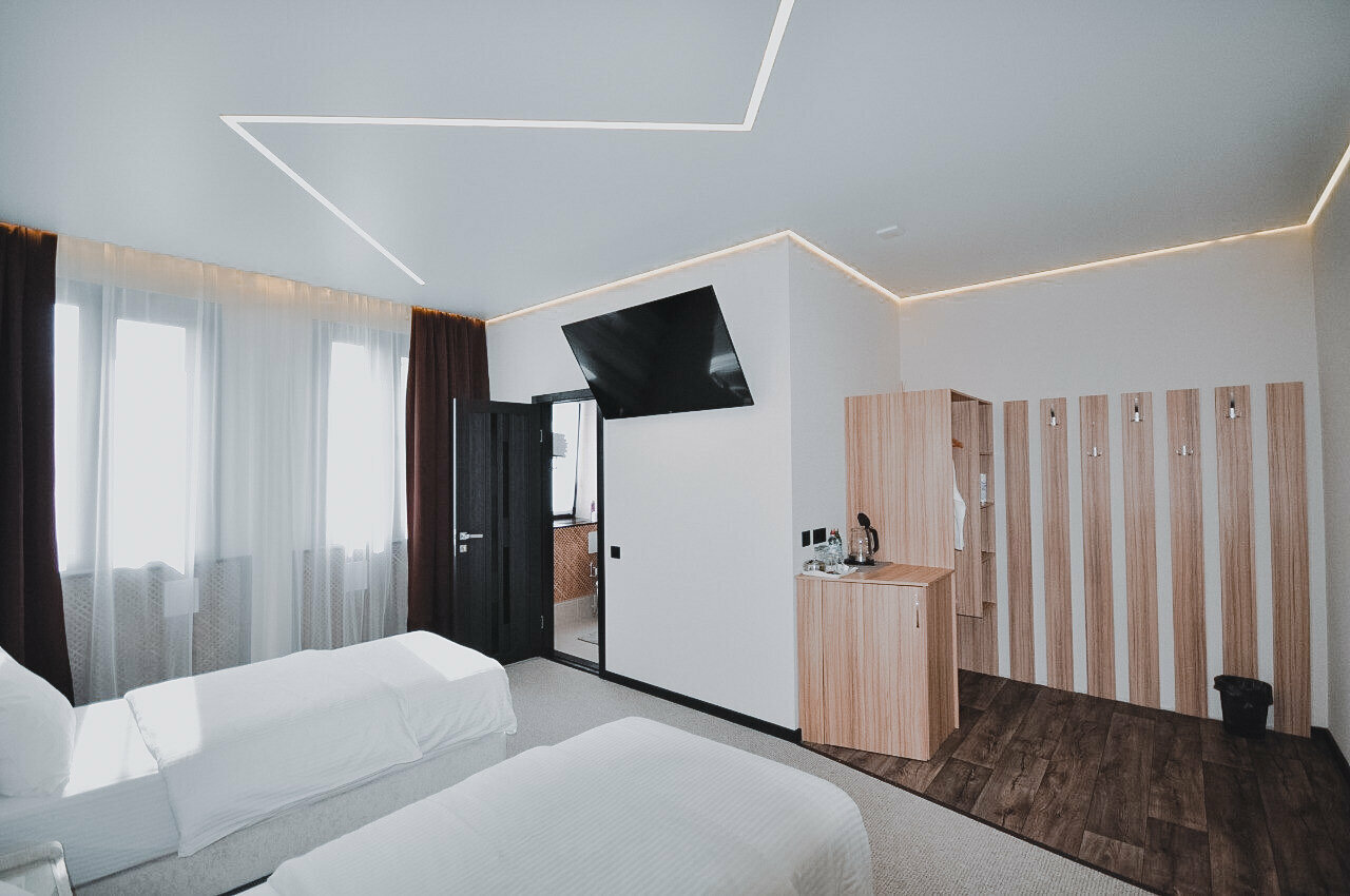 Приятно удивил отель, ремонт хороший, кровать удобная, есть все что необходимо по уровню 4х звезд Единственное может смутить расположение — гостиница находится не в жилой зоне, но если вы проездом, то недалеко от основной дороги Также имеется столовая на цокольном этаже — утром сытный и вкусный завтрак (геркулес, омлет с сосиской, салатик, блинчики или сырники)