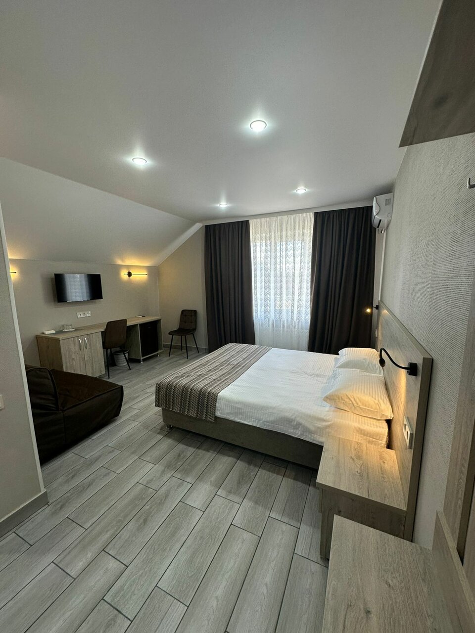 Большой уютный номер повышенной комфортности. В номере предусмотрена двуспальная кровать с диваном. В распоряжении гостей фен, холодильник, набор туалетных принадлежностей, халаты, тапочки ,шкаф, телевизор с операционной системой Android, стол и с...