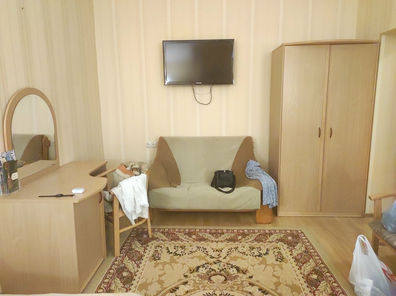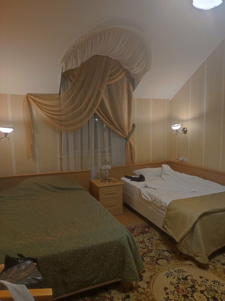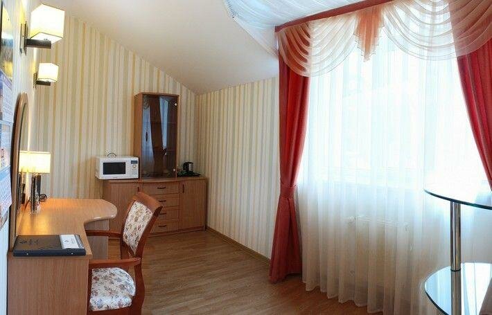 В гостинице мне понравилось всё. Останавливались с семьёй только переночевать. В звездах я не разбираюсь, но соотношение цена-качество соответствуют. Каких-либо ляпов, когда экономят и безобразие маскируют не нашёл. Стульчик только падал и вертикально не держался. Ресторан — это другая тема. К гостинице вопросов нет.