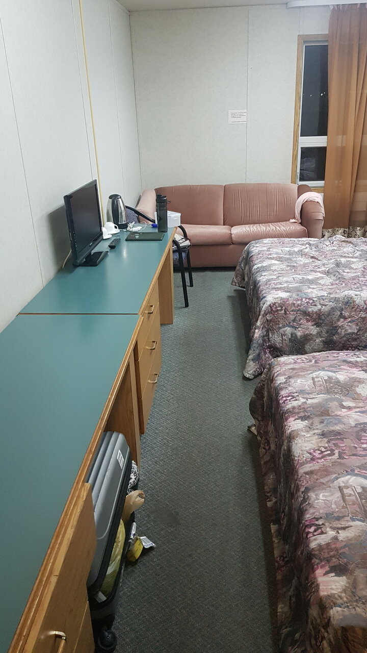 Нужно понимать одно — эта гостиница предназначена прежде всего для полевых инженеров, для ребят, работающих по вахтам на месторождении. Если рассматривать ее как для командировки, то можно. Если для отдыха, для ночевки с женой, семьей, то я бы не стал. Можно и получше и удобнее найти. На завтраке голодным не останешься это точно, но завтрак обычный — каша, яйца, пару выпечки да и все убранства внутри самой гостиницы уже изрядно потрепаны, насколько помню ей уже наверное в районе лет 30, канадцы ее построили и до сих пор унитазы и ванны ещё с тех пор наверное, но все работает как часы. Так что понимайте свою цель ночевки и решайте — нужно вам тут или нужно в другом месте.