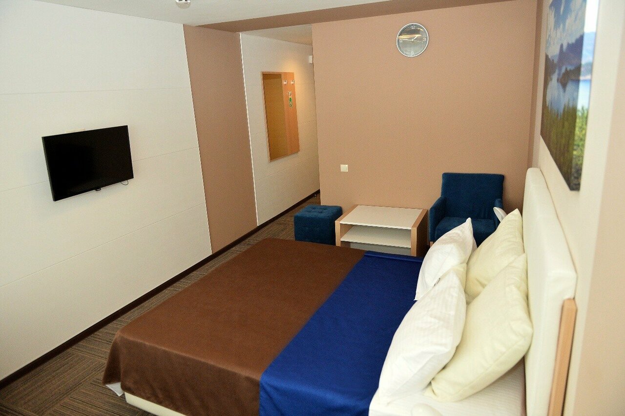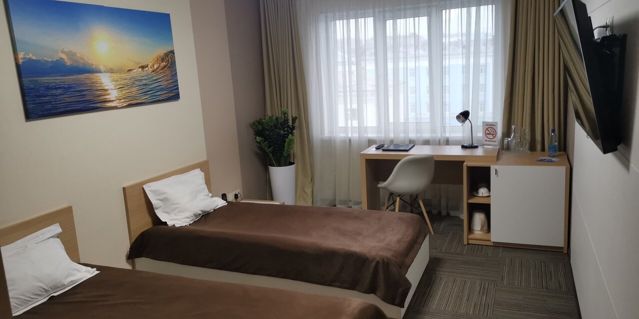 Стоимость номера зависит от дат! Уточняйте у администратора.Площадь номера 20-22 м2. Вмещает до 4х человек: 2 основных и 2 доп. места.Одно доп. место предоставляется бесплатно, второе - 500 р./сутки с 5 лет. Есть вся необходимая мебель и техника.