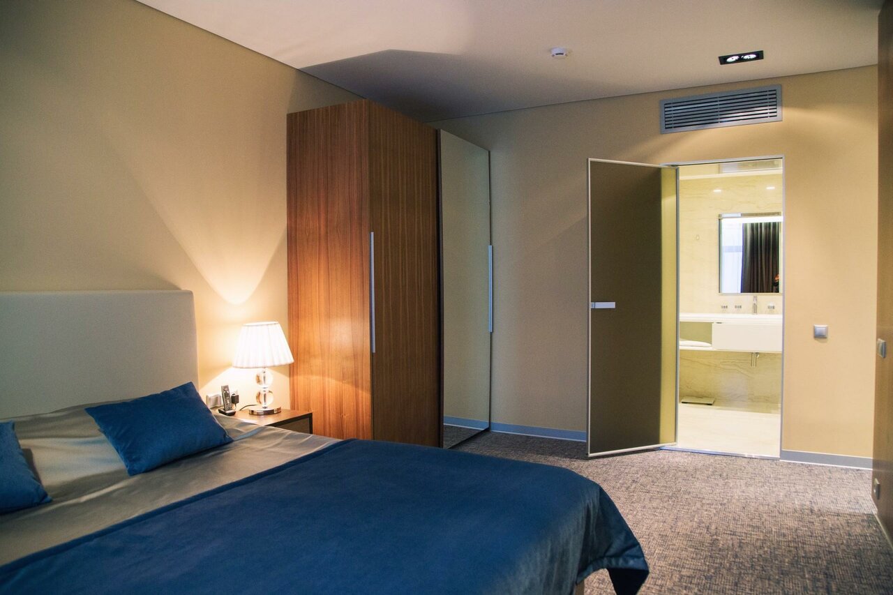 Гостиница 5 звёзд, но я бы дала меньше. У меня был номер Стандарт. В небольшом номере есть двухспальная кровать, 2 тумбочки, телевизор с плоским экраном, узкий длинный стол, мини-бар, шкаф, кондиционер, чайник с посудой для чая. В ванной комнате угловая душевая кабина имеет с полом общий уровень. Дверь открывается наружу. Т. е. при выходе из кабины открывающейся дверью перемещается полотенце для ног. Неудобно. В ванной есть набор полотенец, фен, необходимые принадлежности, халат. В стоимость номера входит завтрак. Это не шведский стол, а на выбор 3 варианта завтрака. Есть с кашами, есть с сырниками, есть с яичницей с ветчиной. Порции небольшие. В день отъезда завтрак не положен, но если хотите, можете его оплатить и позавтракать (450 руб). В гостинице есть ресторан — утром в нём завтракаем, в другое время — обедаем и ужинаем, если можем себе это позволить (дорого). В целом — тихо, чисто, персонал приветливый.