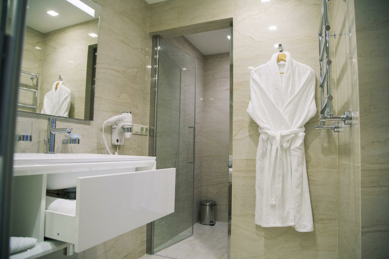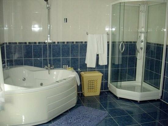 - Неудобная душевая кабина (дверь открывается наружу, сдвигает полотенце).