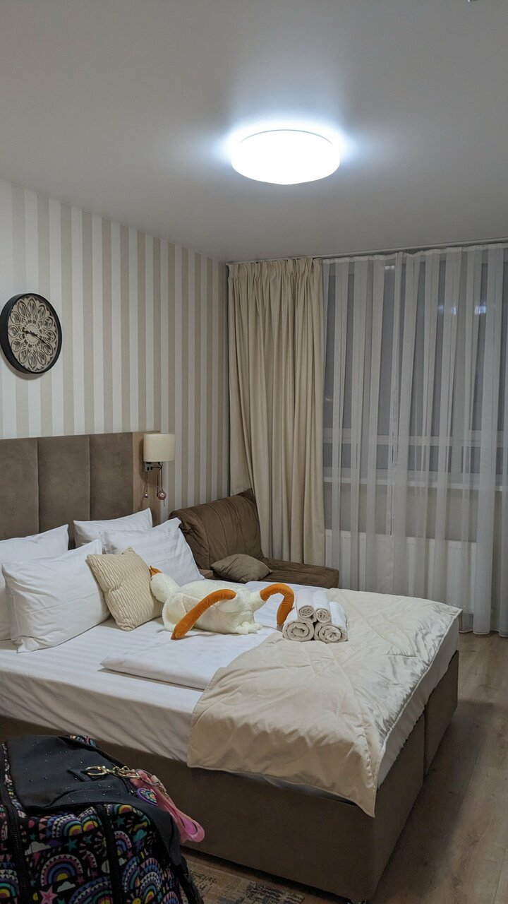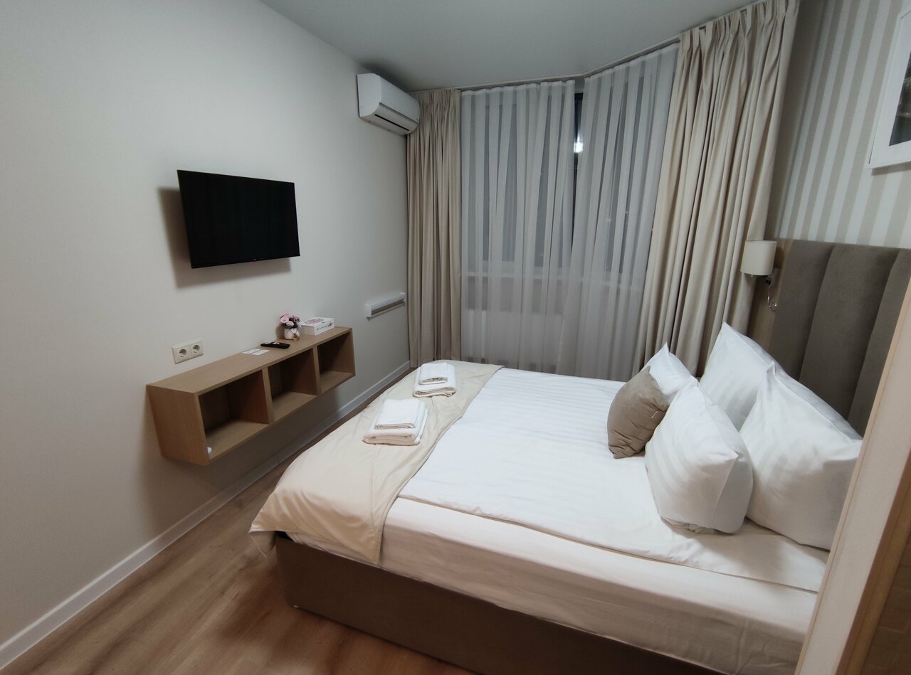 Все хорошо и аккуратно. Квартира переделанная под мини отель в жилом доме Предусмотрели все до мелочей , молодцы , даже стиральная машинка ! Единственное я бы улучшил сигнал интернета Wi fi + добавил бы кофе с утра его оч сильно не хватало А так ребята молодцы