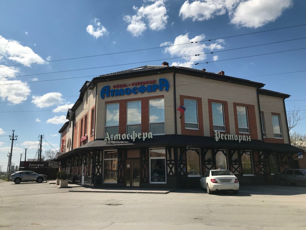 Гостиница «Атмосфера» (Новочеркасск, ул. Ященко, 37/42) — трёхзвёздочный мини-отель с круглосуточным обслуживанием. Предлагает комфортабельные номера с кондиционером, санузлом, звукоизоляцией, Wi-Fi, телевизором и мини-баром. Для гостей доступны: бесплатная парковка, завтрак, кафе, ресторан, бар, терраса и сад. Удобства включают химчистку, прачечную, камеру хранения, трансфер, конференц-зал и детскую площадку. Разрешено проживание с животными. Телефоны: +7 (928) 903-55-67, +7 (8635) 26-59-69. Заезд и выезд — в 12:00.