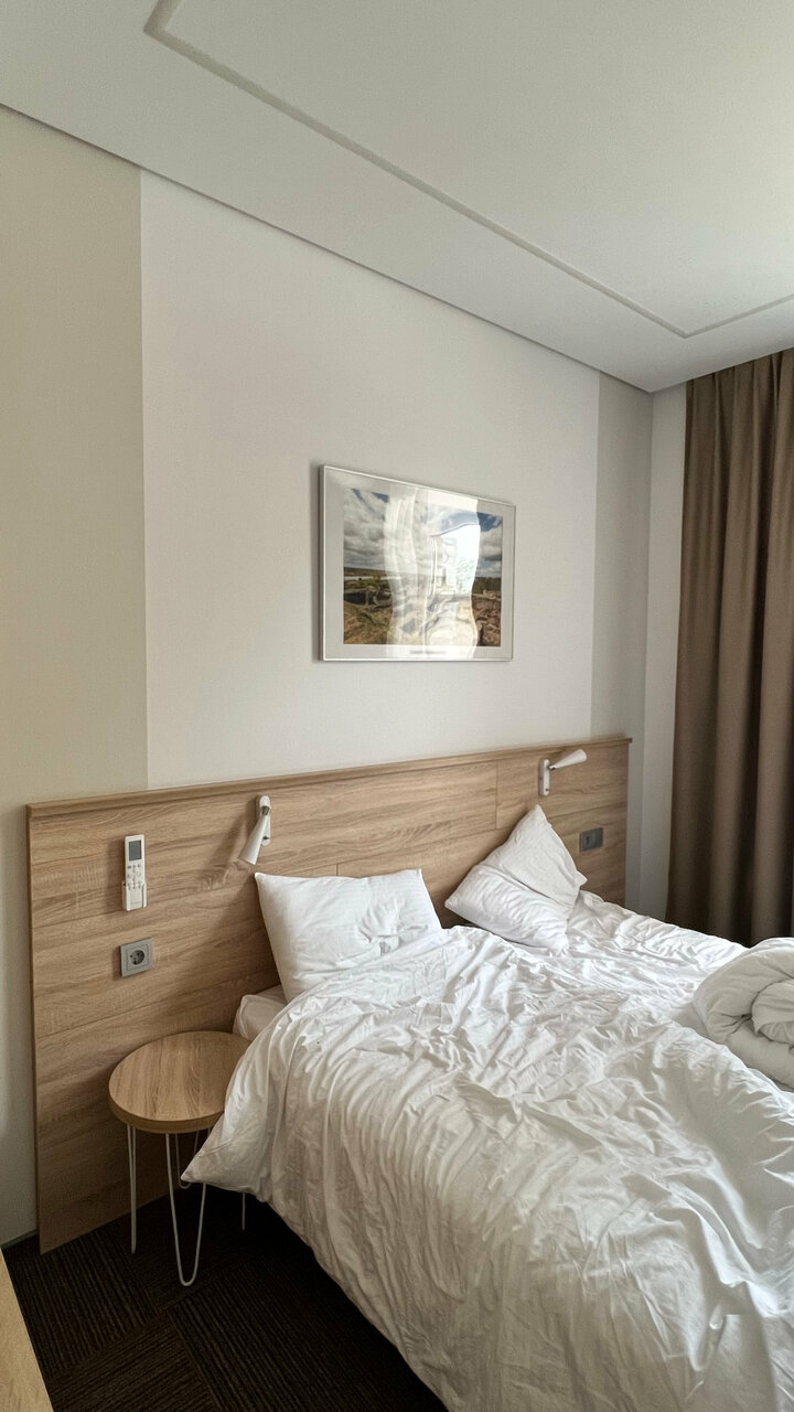 Повелись на отзывы и фото. А по факту номер был малюсенький, вдвоем не разойтись. До заселения номер посмотреть нельзя, мне было важно, чтоб кондиционер не дул на кровать, меня заверили, что такого не будет, а на деле номер настолько мал, что кондей дует везде, никуда от него не спрячешься, а в жару под 40 без него никак. Кровать жёсткая, постельное тоже какое-то дубовое. Единственное, ванная комната хорошая, чистая, большая, с мылами-бальзамами и т.п.
