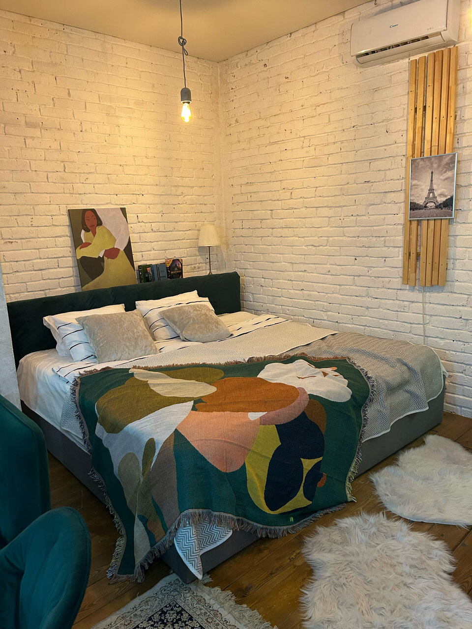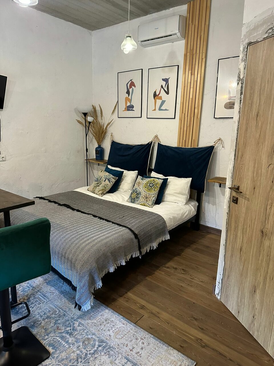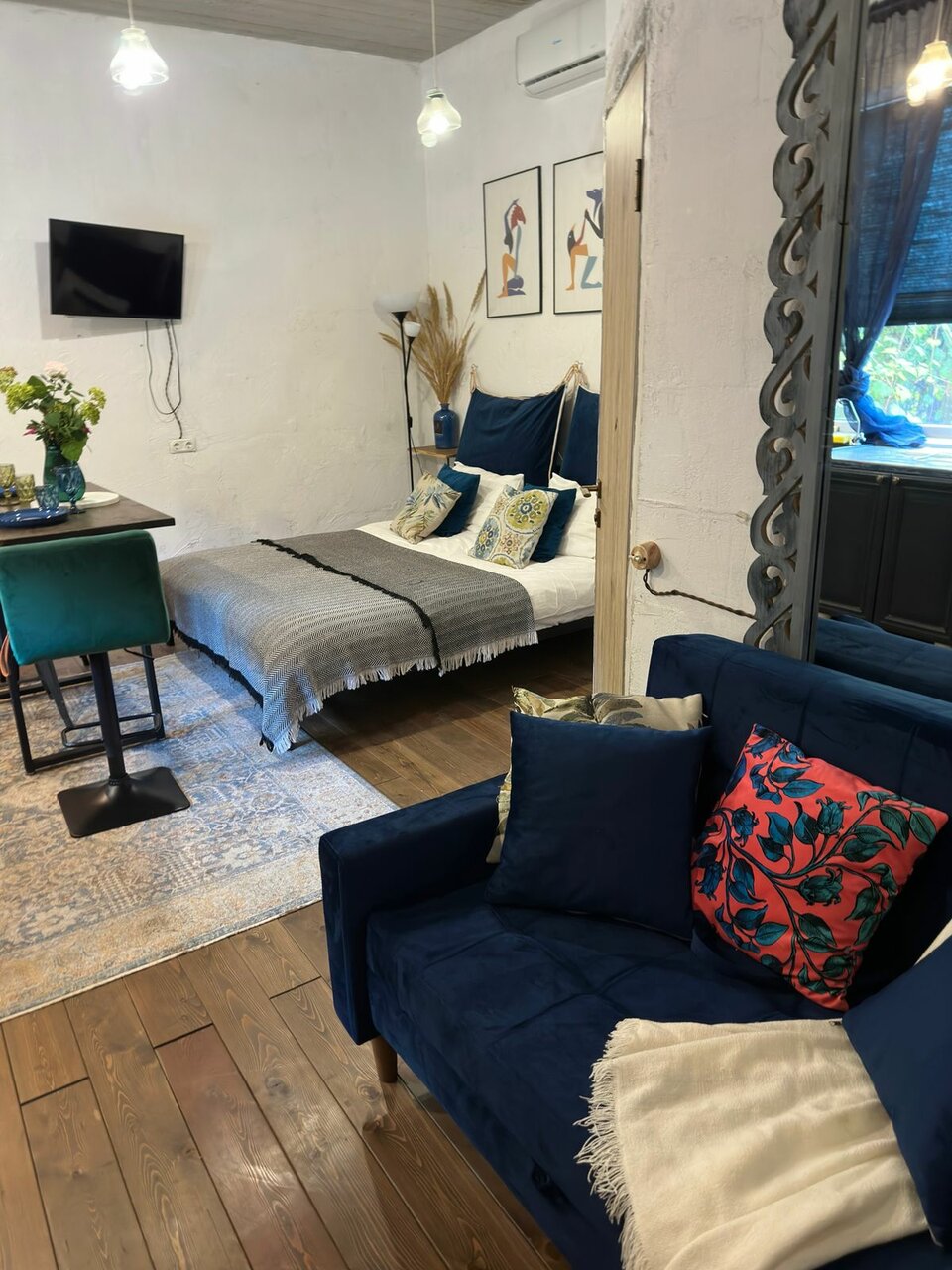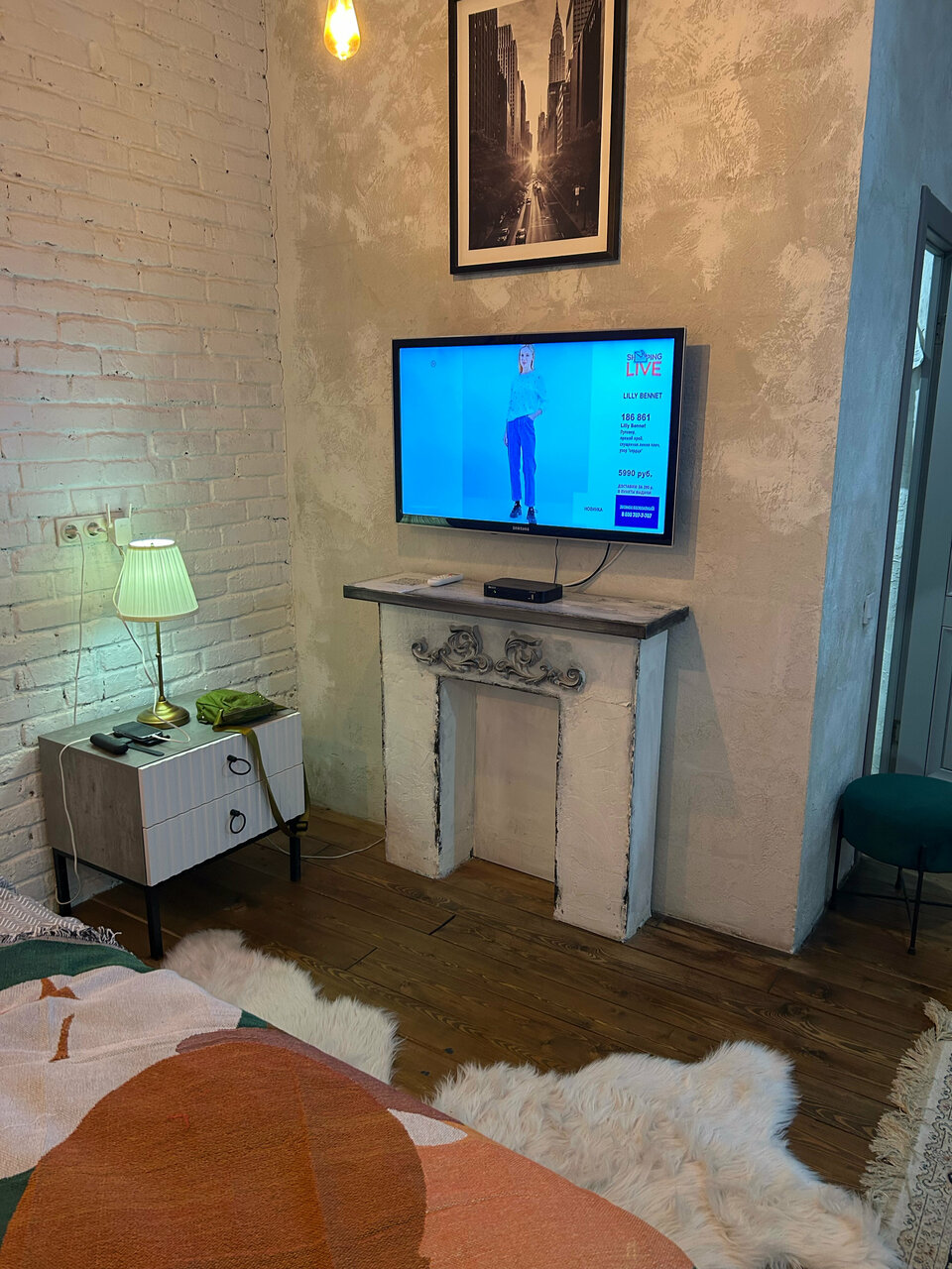- Уютная зона отдыха (кровать, ТВ, диван, книги).