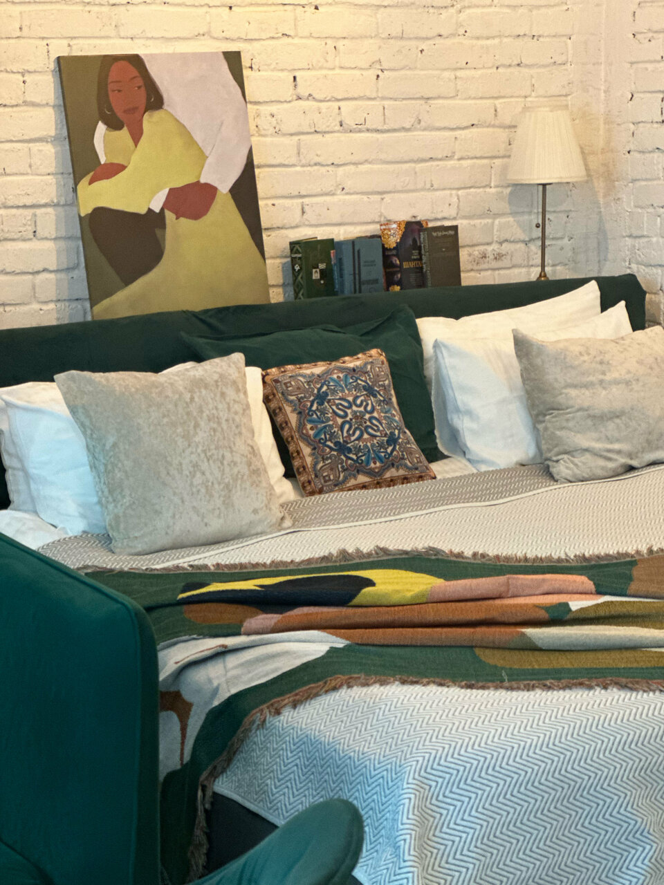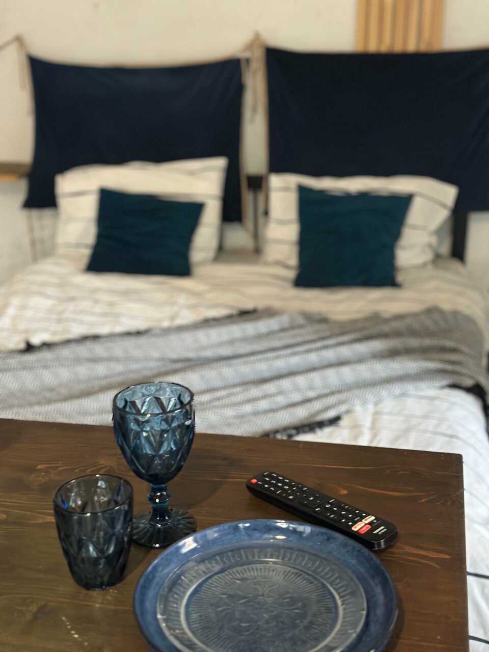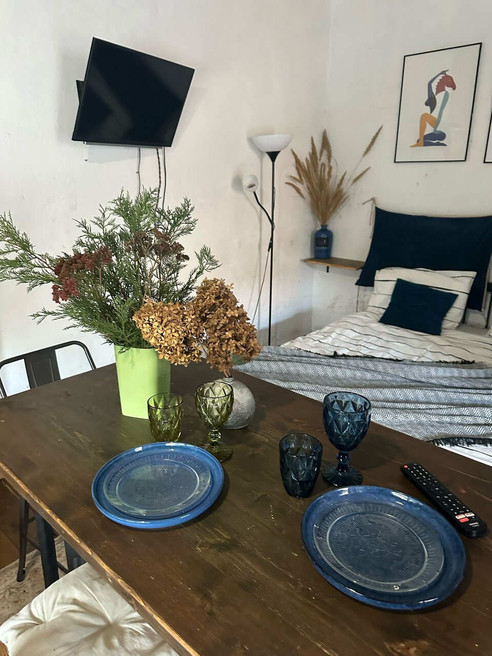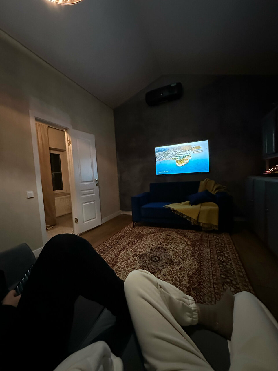 - Уютная зона отдыха (кровать, ТВ, диван, книги).