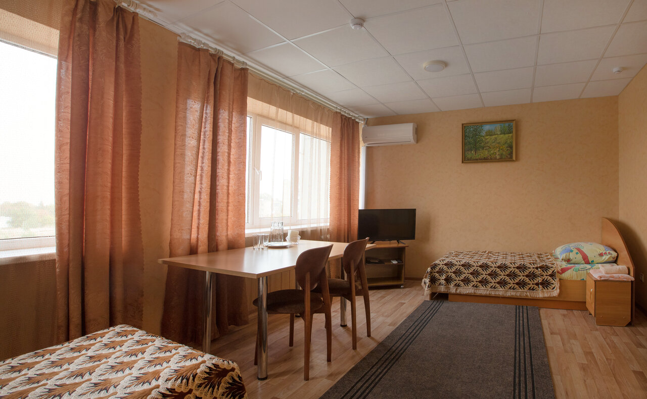 - Номера как однокомнатные квартиры (кухня, плита, холодильник, посуда).; Удобное расположение (близко к лесу, 10 минут до вокзала).; Возможность питания в столовой отеля.; Вкусные завтраки и обеды по доступной цене.; Новая мебель и техника (кондиционер, холодильник).