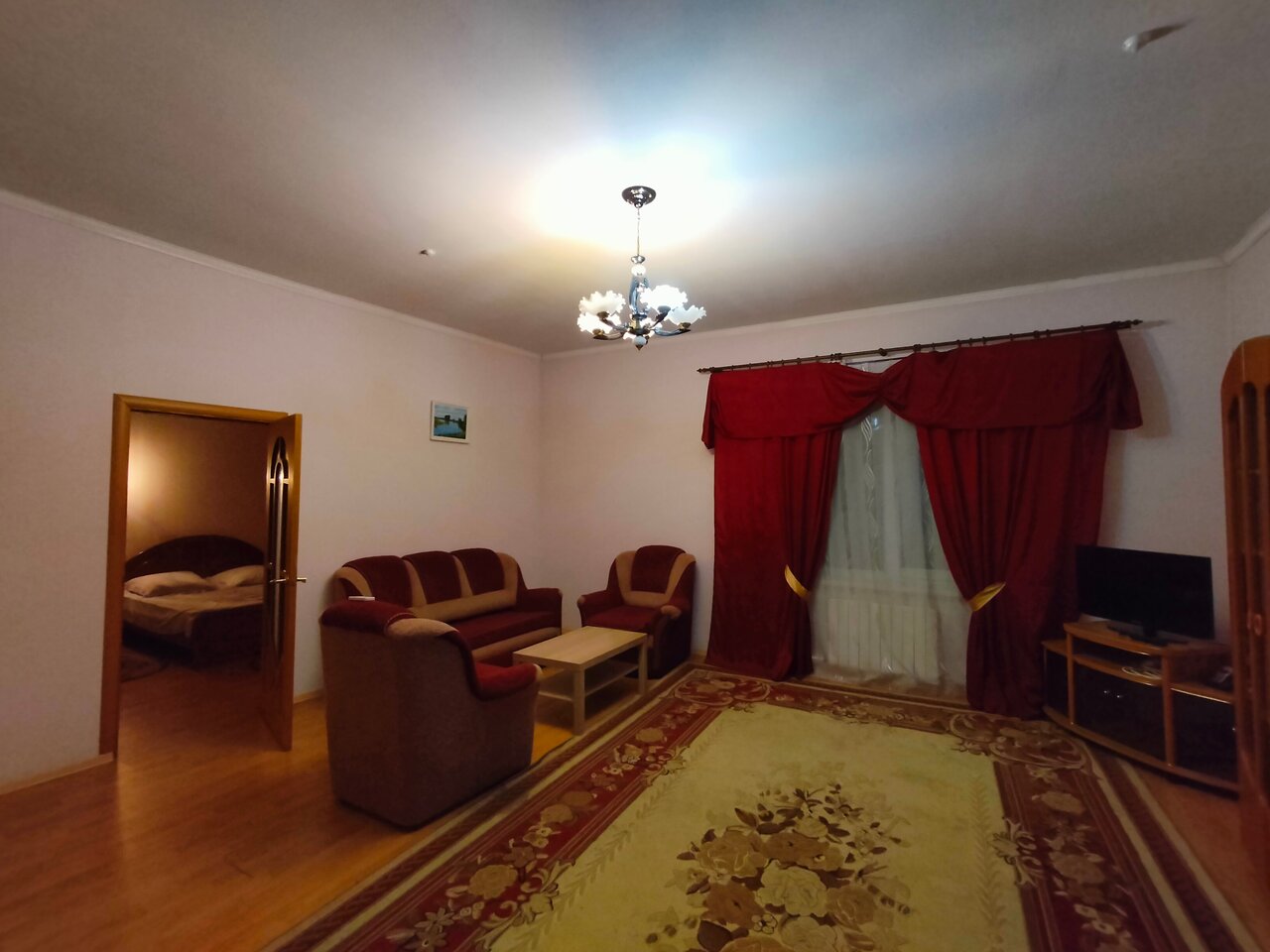 - Большой номер с телевизором, диваном, кроватью, холодильником, кондиционером и просторной ванной.