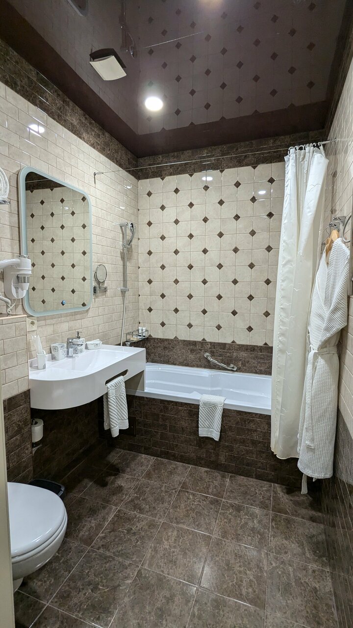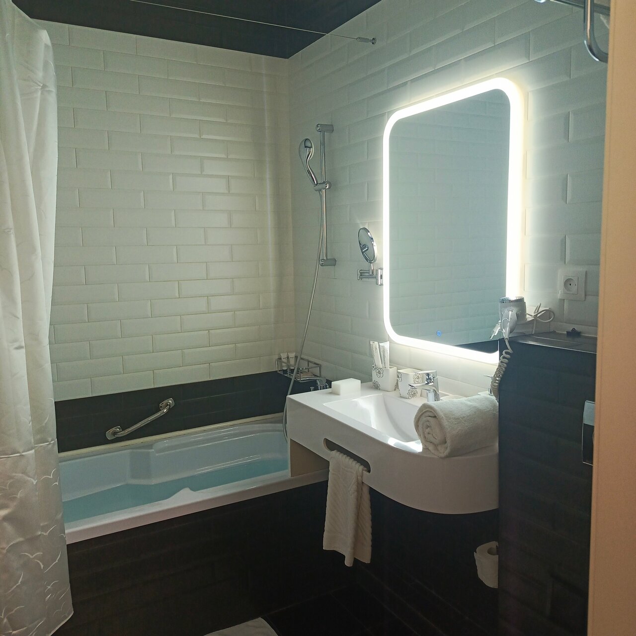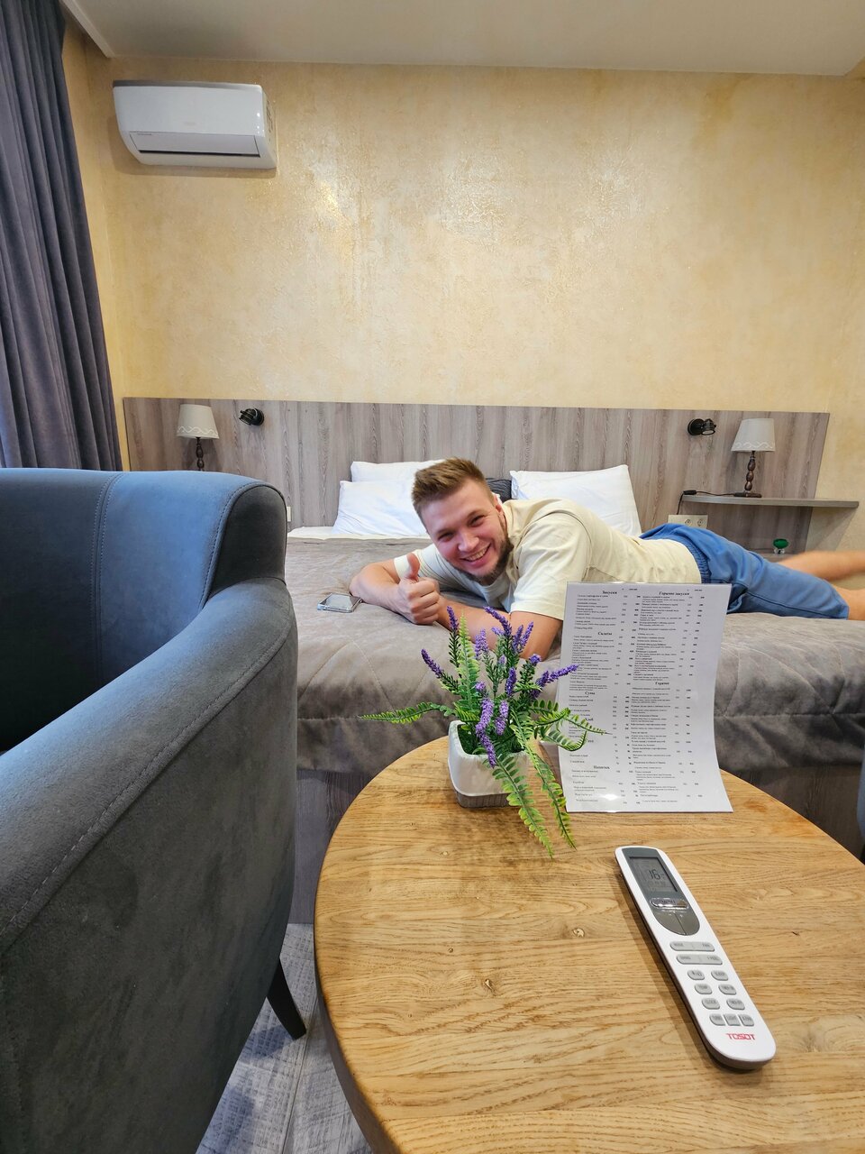 Все отлично, номер хороших ремонт большой холодильник, телевизор большой, были на 4 этаже с видом на море, моле буквально в 50 метрах от отеля , в номере слышно прибой, пахнет морем в номере, так близко к морю еще не были в отелях, вкусно кормят в ресторане, вежливые сотрудники , в номере большая ванная , можно принять ванну, что не всегда встречается в отелях. Стоимость не высокая. Спасибо за прекрасный отдых