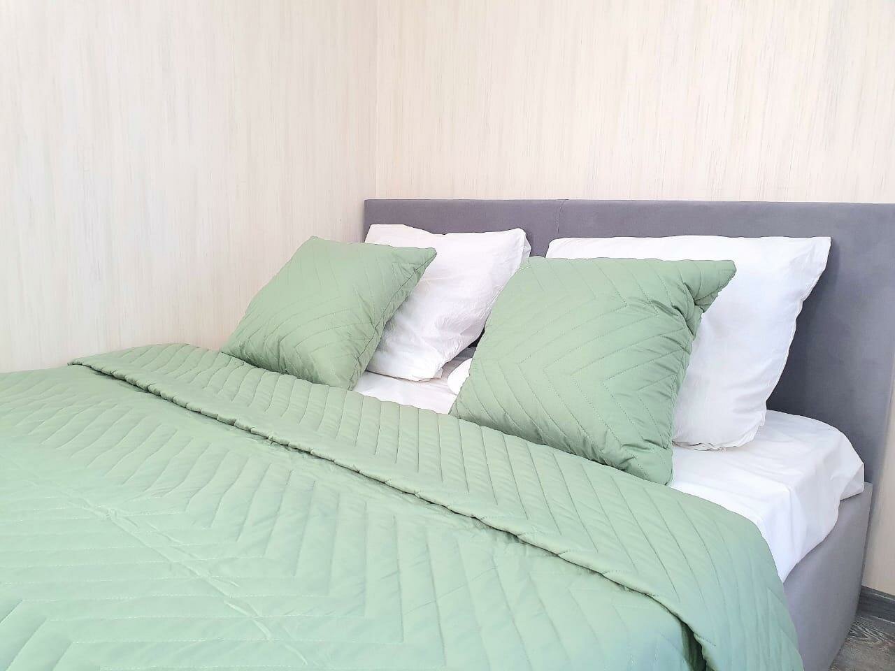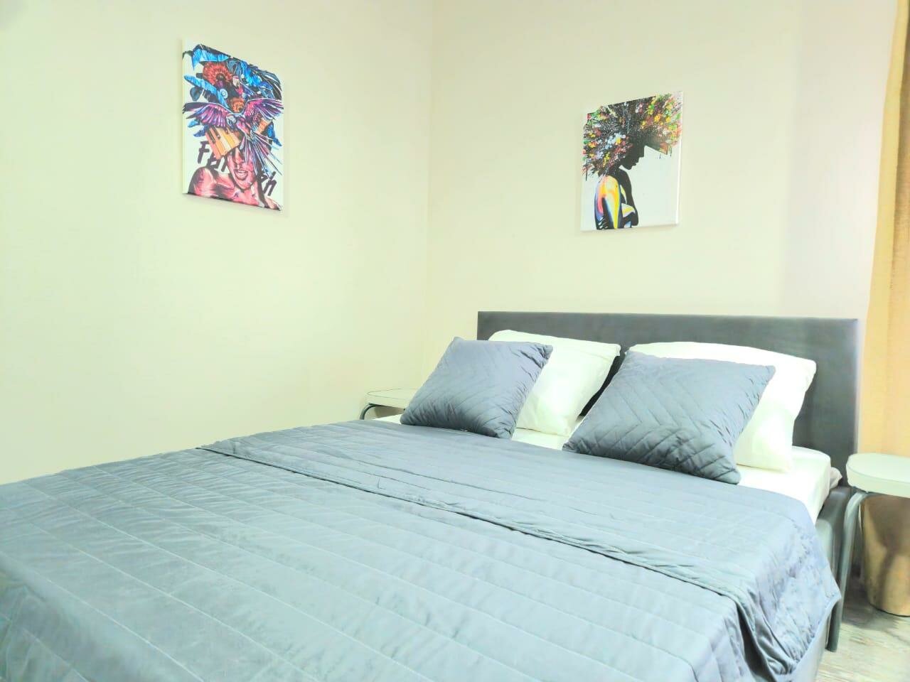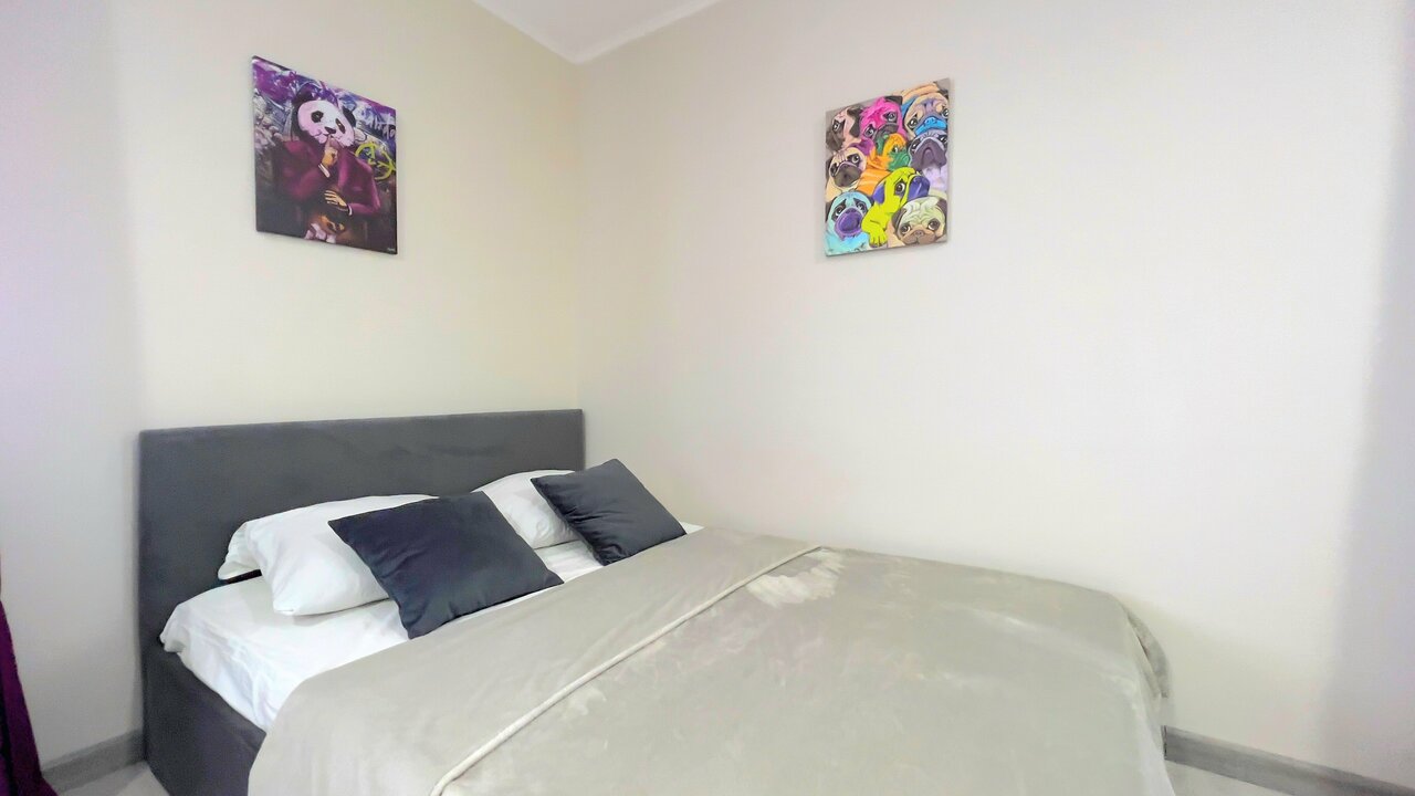 Большая двуспальная кровать. Панорамные окна - по всей комнате. Полноценная кухня, вся необходимая техника: чайник, холодильник, стиральная, посудомоечная машина и кофеварка. Идеально для семьи или 2-5 человек. Размер двух комнатных апартаментов 100м