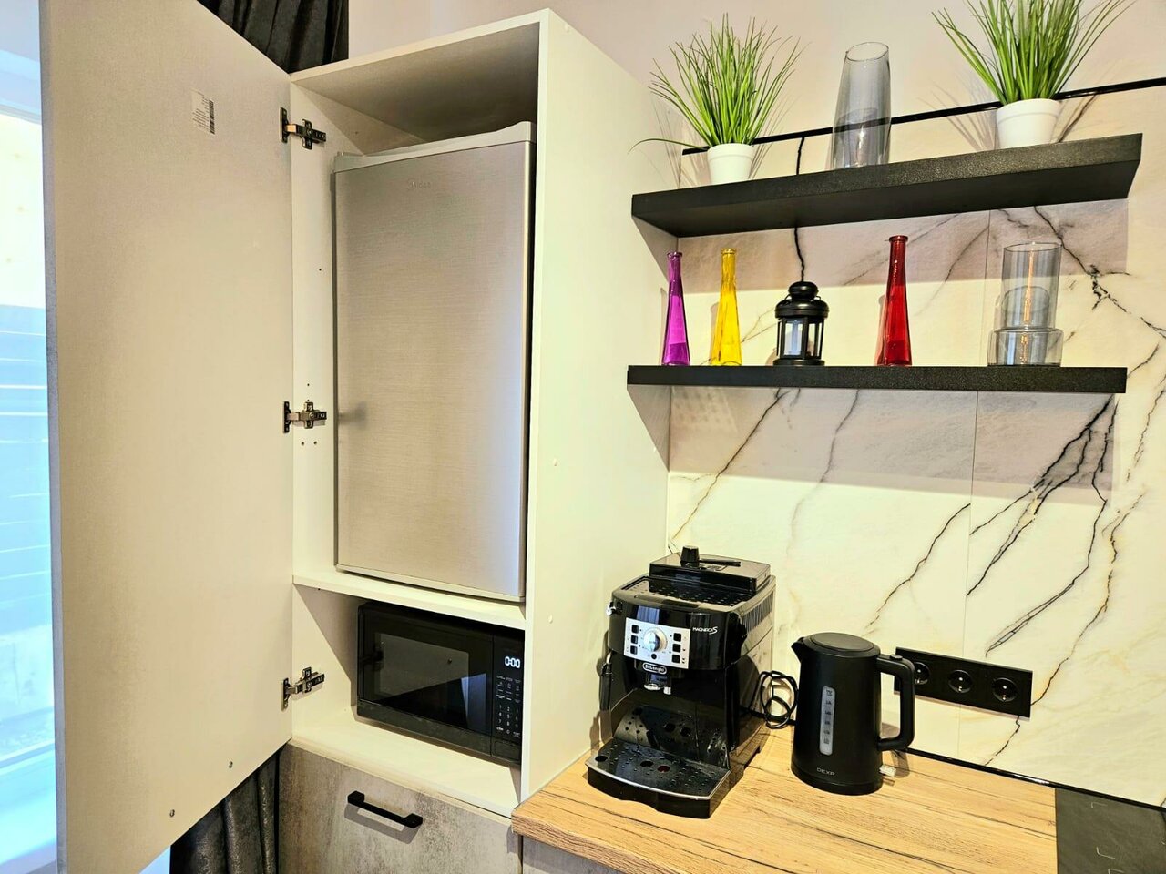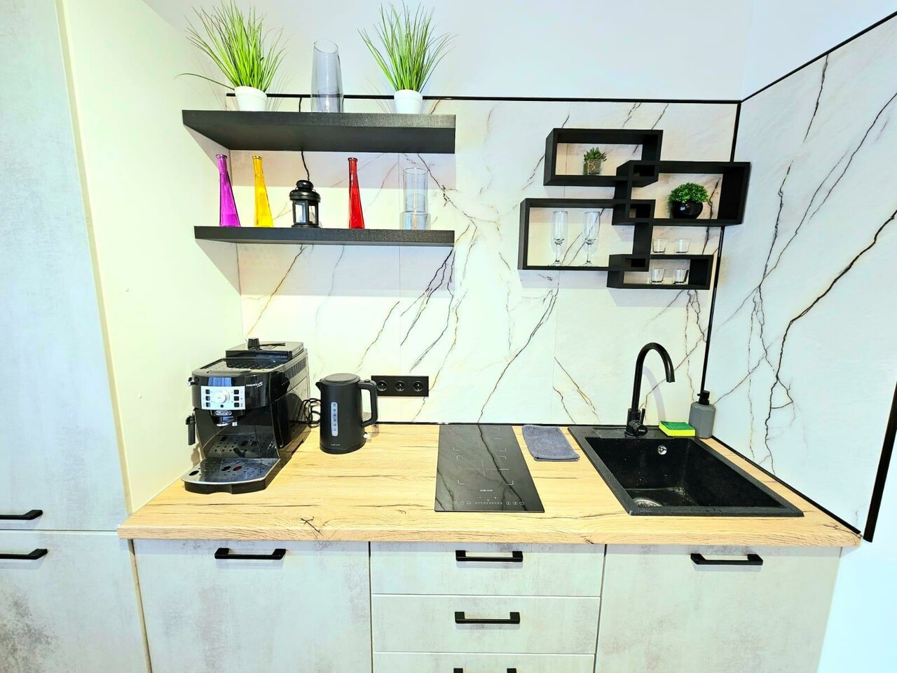 - Хорошее оснащение (кофемашина, сушилка, мини-кухня).