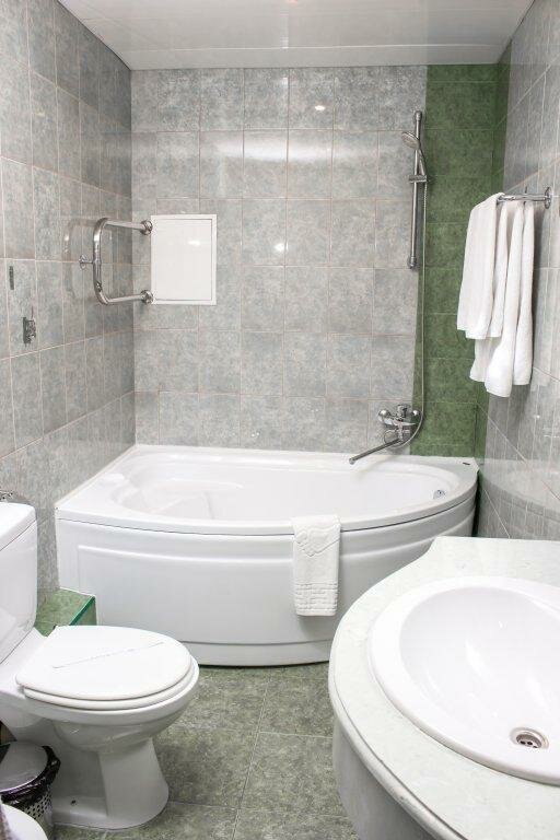 Не дорогой тихий отель. Построен еще при советах, старенький, но в номерах чисто. Непонятно для чего в номере стоит телефон по которому невозможно никуда дозвониться. Оконный кондиционер, шумный и маломощный. Хорошо, что ночью еще прохладно и открытое окно в тихий двор, поющие птички приятно порадовали. Убирают каждый день. Персонал улыбается. В кафе вкусный завтрак. большой респект Дмитрию работнику кафе Капитан!