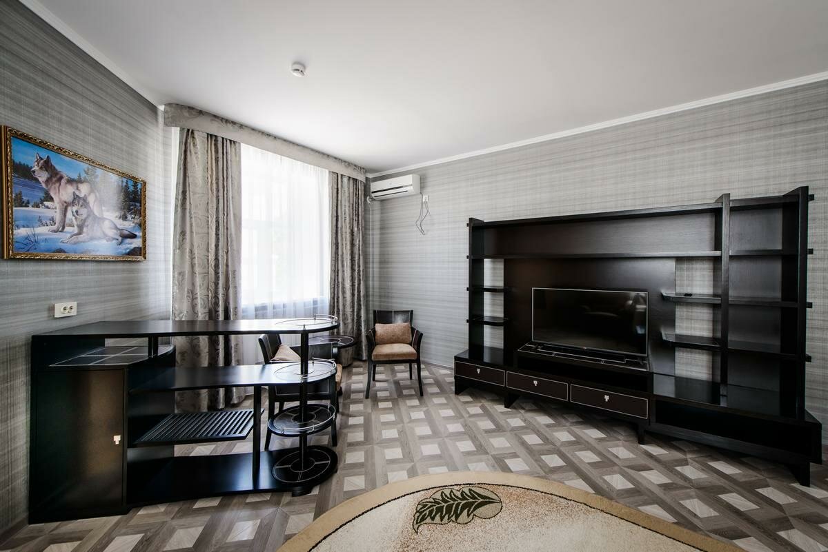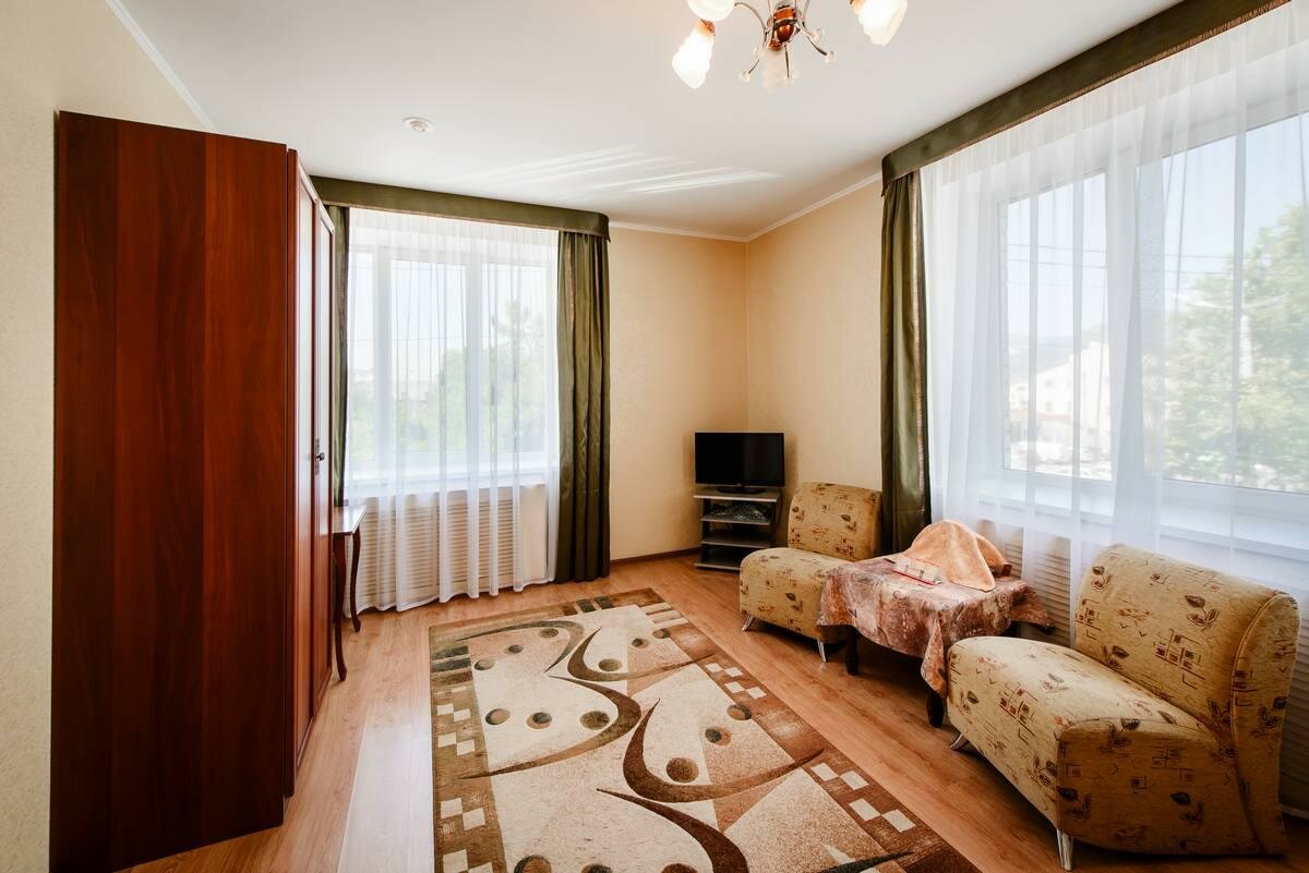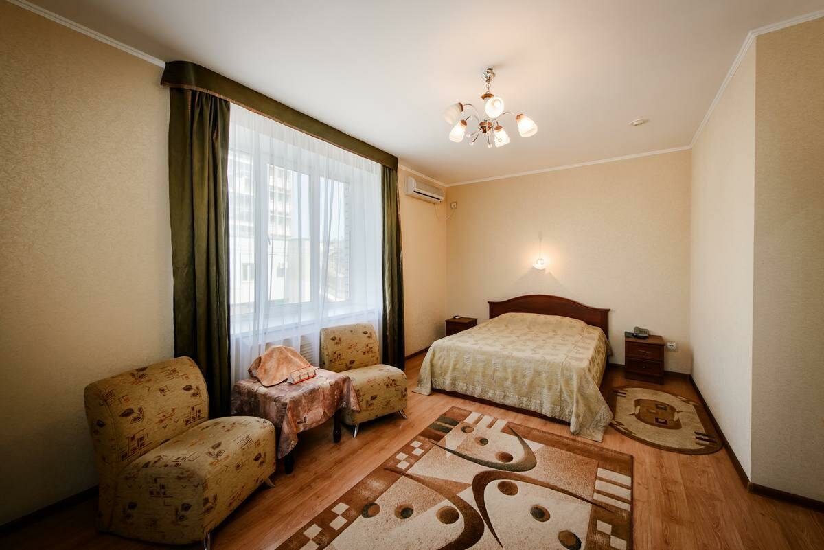 Оставались на 2 ночи, все супер! Цена-качество — наилучшее соотношение. В номере есть все: чайник, холодильник, фен, тв, вайфай, кондиционер и пр. Питание хорошее. 5мин до главной улицы города — советской, 20мин до набережной. Из недочетов — отсутствие некоторых плафонов, небольшой запах в туалете