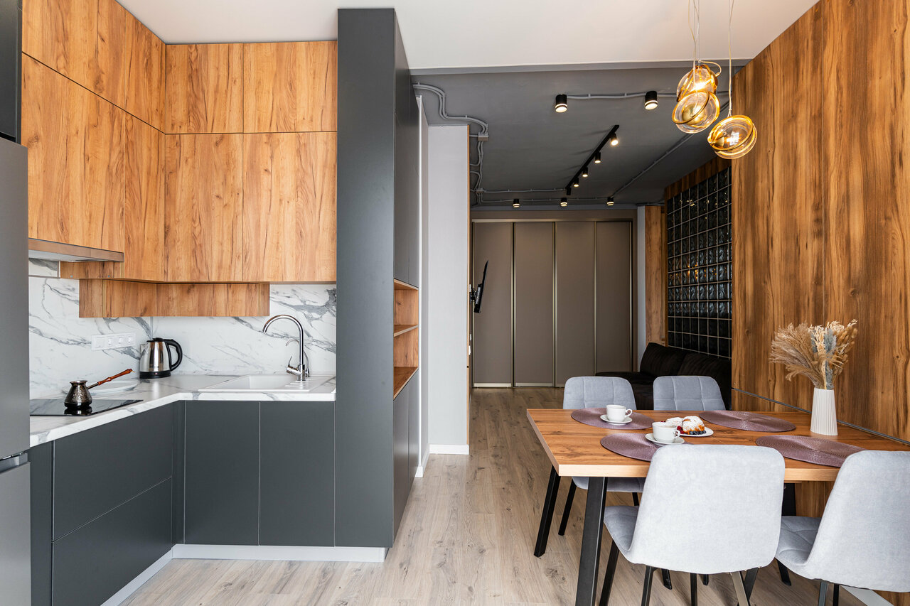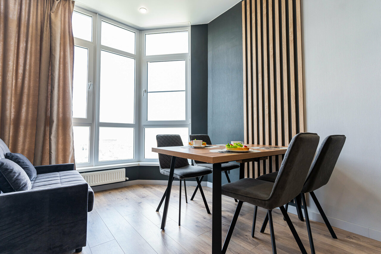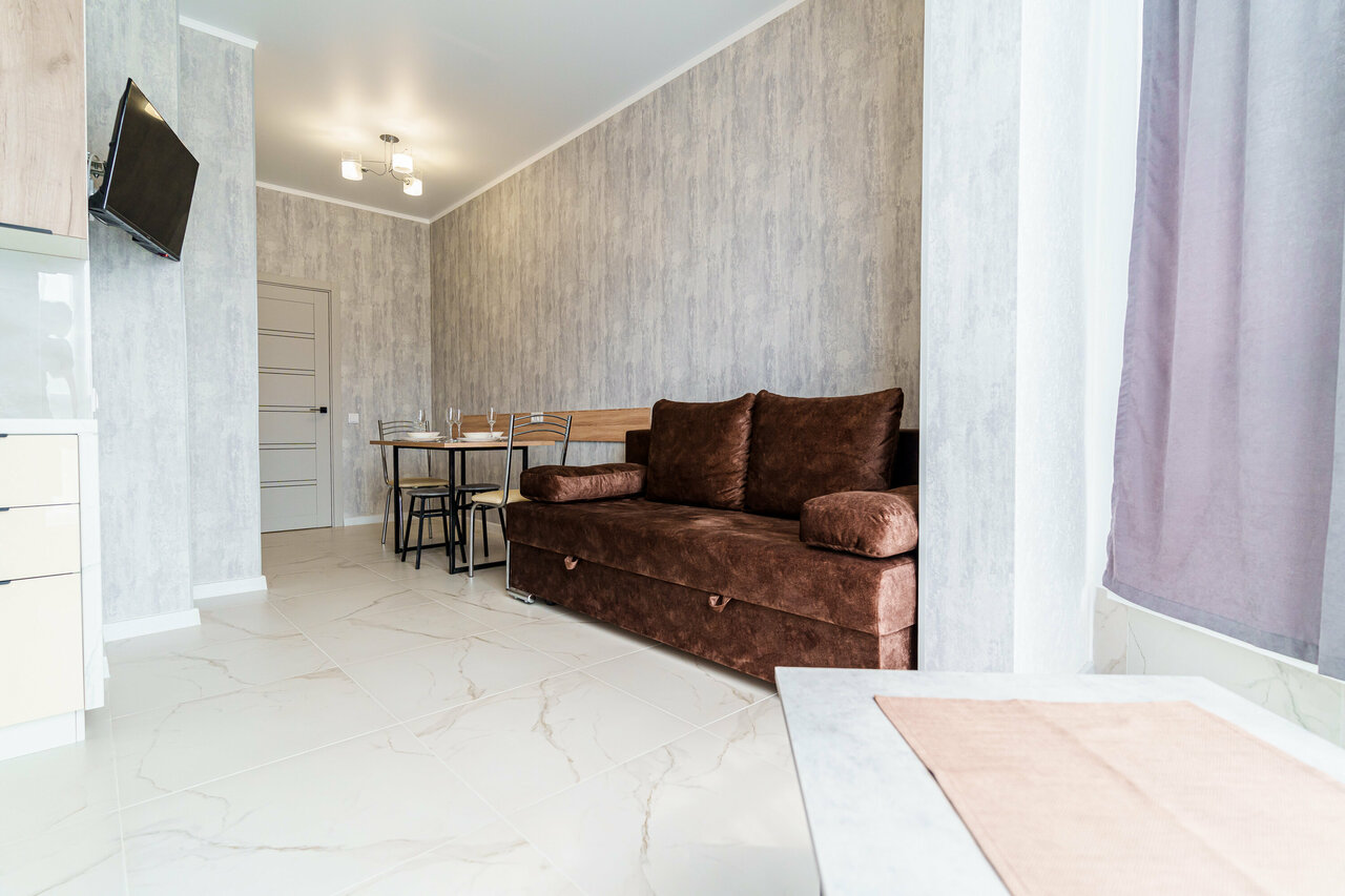 Стильная студия для троих гостей, шикарный ремонт, шикарный дизайн, Сразу видно, что квартира сдаётся после ремонта, свежая, очень чистая Нас было трое, ребёнок спал на диване, там есть отдельное спальное место, если вы не вдвоем) вид из кухни на город, панорамное большое окно!всё есть для готовки, а также можно сварить с утра кофе — для этого есть турка) Эмоции только положительные после данной квартиры вода была, свет был- что является для Новороссийска большой проблемой замечаний во время проживания не было ставлю пятёрку!!! буду рекомендовать своим друзьям спасибо!