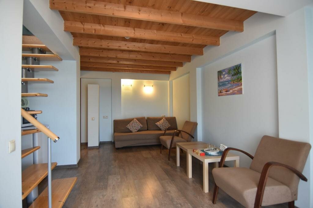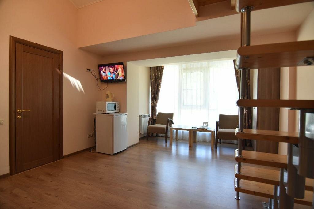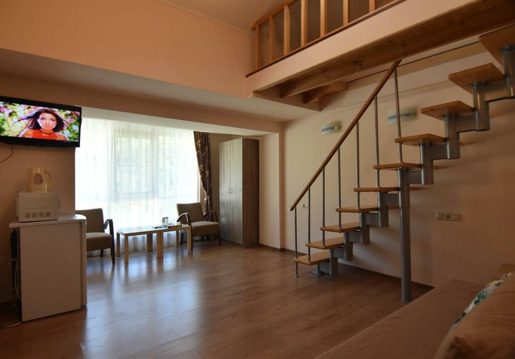 Фото номеров соответстуют. Номера отличные. Дороги не слышно. Пляж рядом, но не оборудован. Вход — скользкие камни. Есть возможность питаться на территории. В апартаментах СВЧ, холодильник и чайник. Но общей кухни, к сожалению, нет. Рядом ни кафе, ни магазинов, ни людей. Рай для интроверта))). Море не очень. Иногда запах мазута и пятна на воде ((.