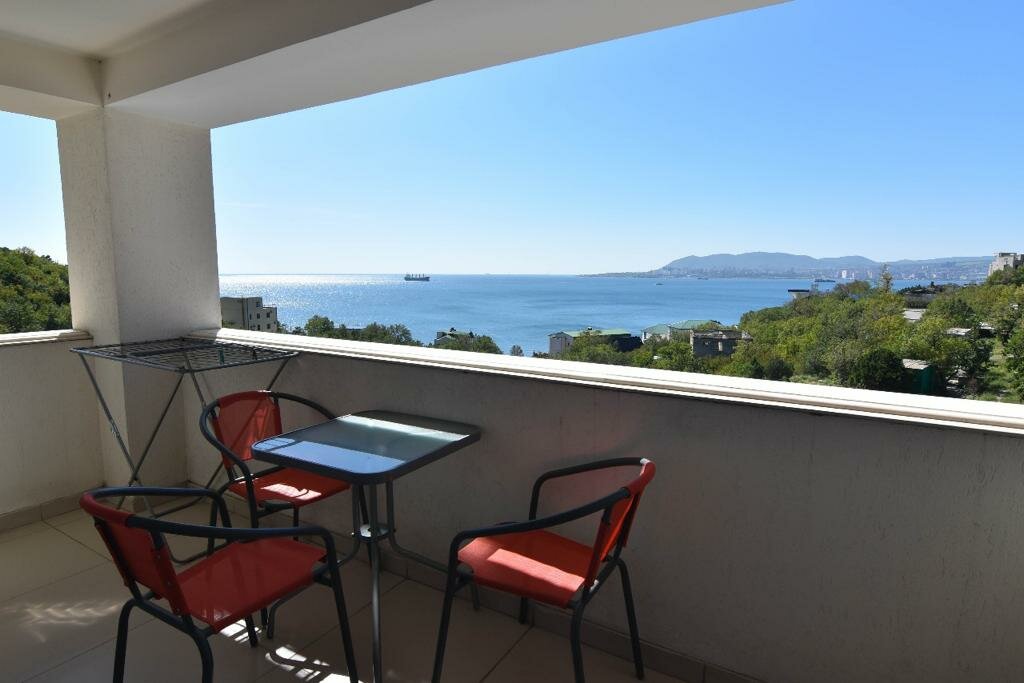 Трехкомнатные апартаменты класса DeLux с двумя спальнями, гостиной и отдельной зоной кухни и террасой с великолепными видами на море, горы и Приморский парк. Вместимость: до 5 гостей (4 на основных местах, 1 на дополнительном).