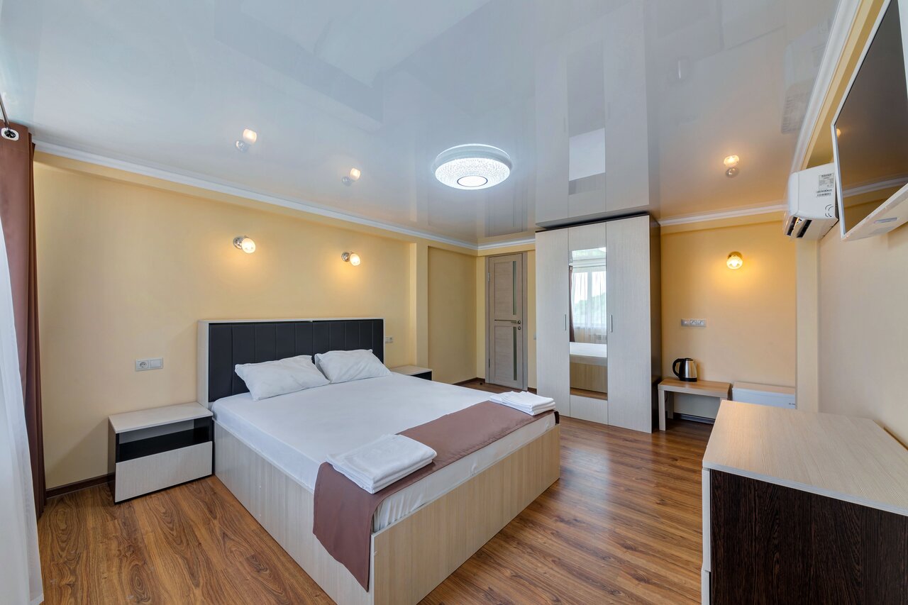 Апартаменты-студия. Идеально подходят для пар и командировочных гостей. Вместимость: до 2 гостей (2 на основных местах + 3 на дополнительных).Комплектация апартаментов: двуспальная кровать размером 160*200 см, санузел, гардероб, мини-кухня