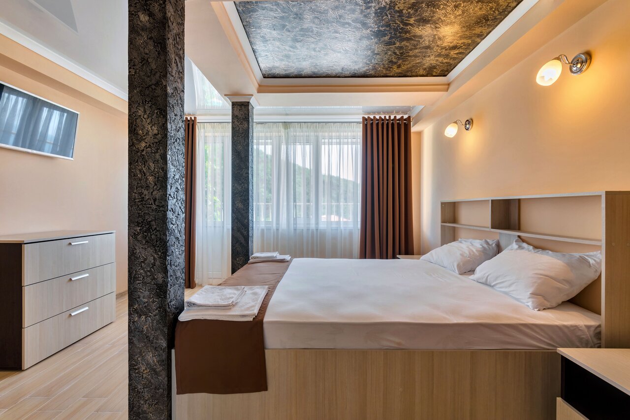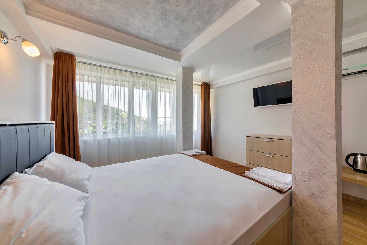 Апартаменты выполнены в виде студии с отделенной зоной спальни. Идеально подходят для пар и семейного отдыха с детьми. Вместимость: до 4 гостей (2 на основных местах + 2 на дополнительных).
