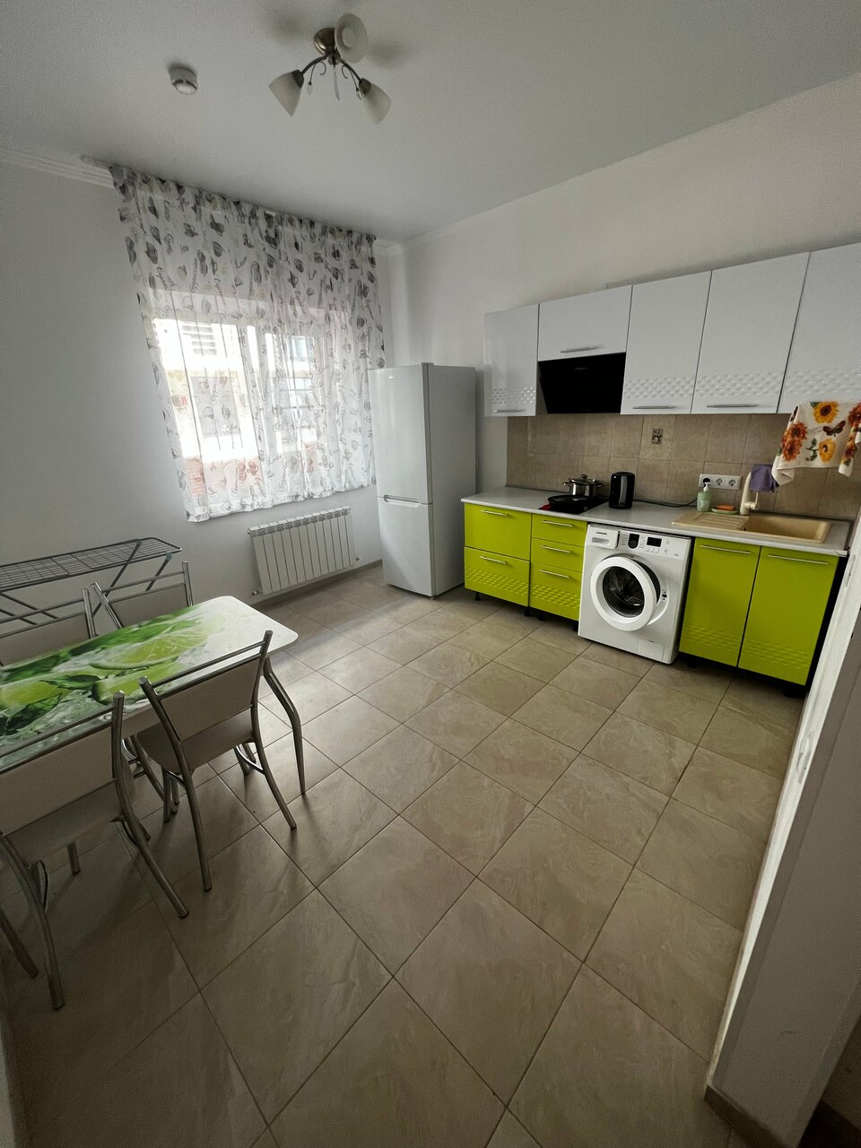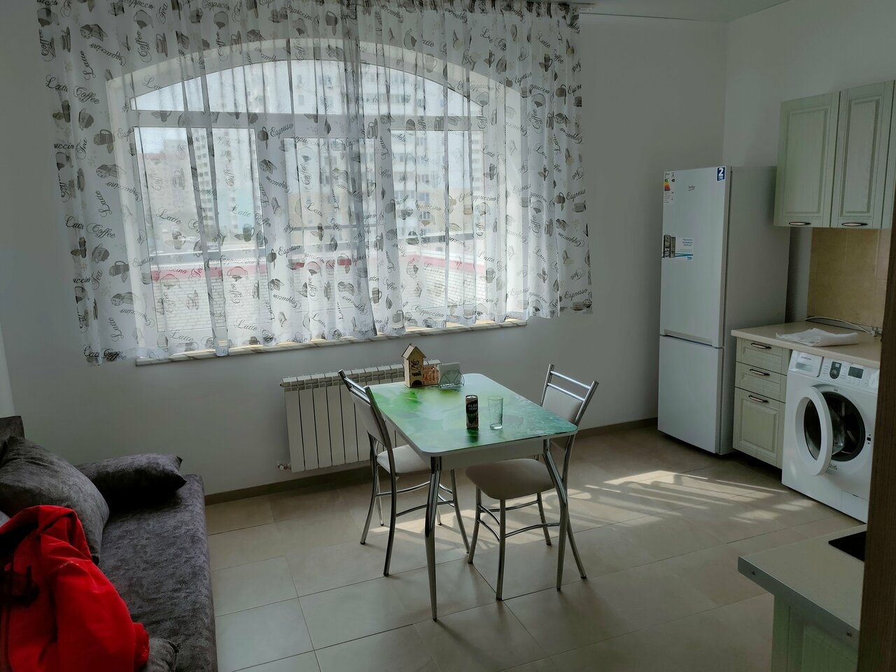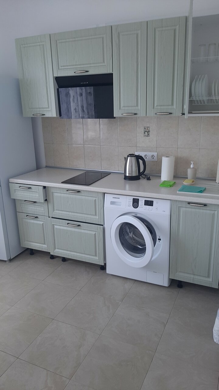 - Наличие кухни с посудой и техникой (варочная панель, холодильник, стиральная машинка).