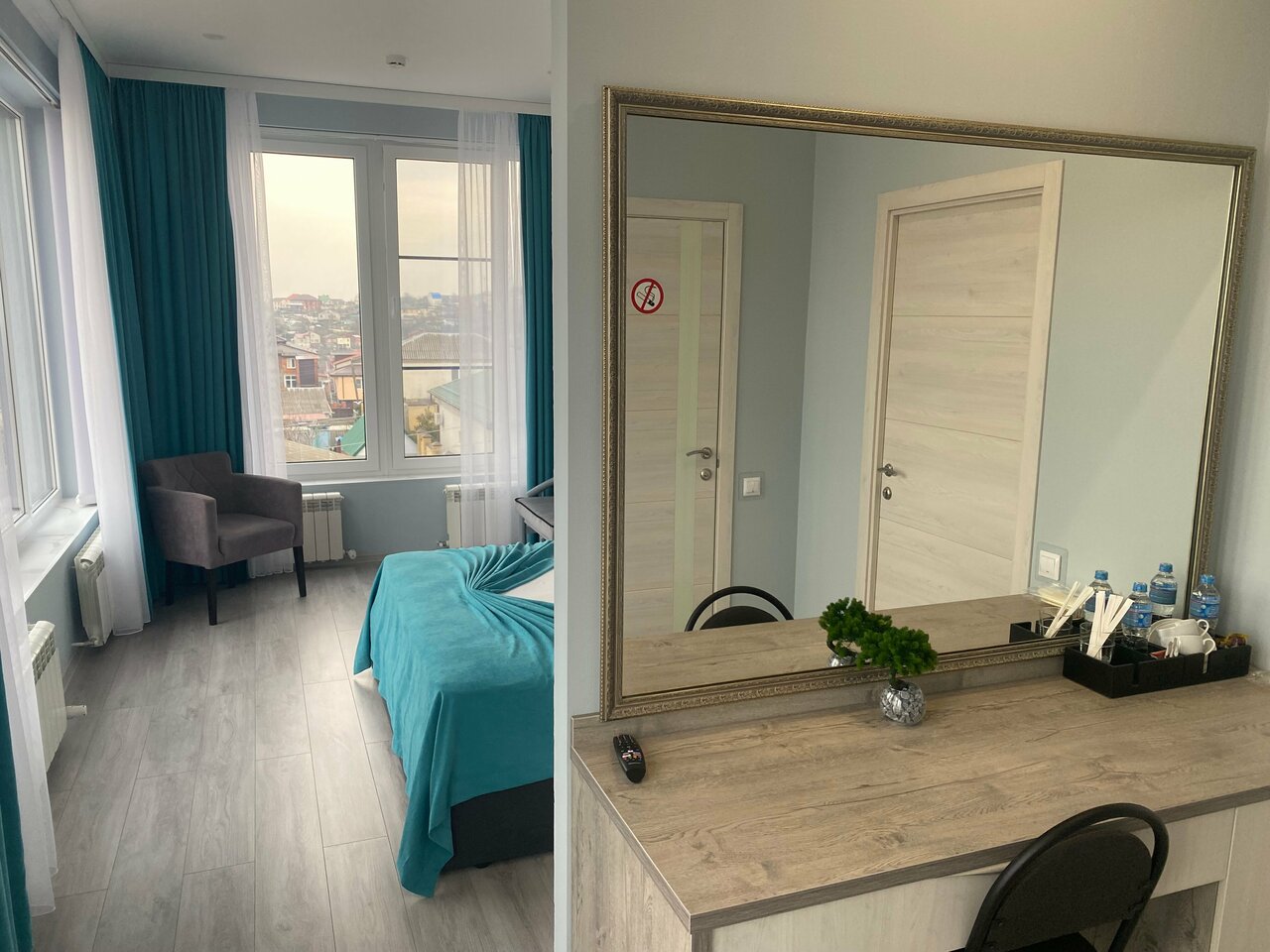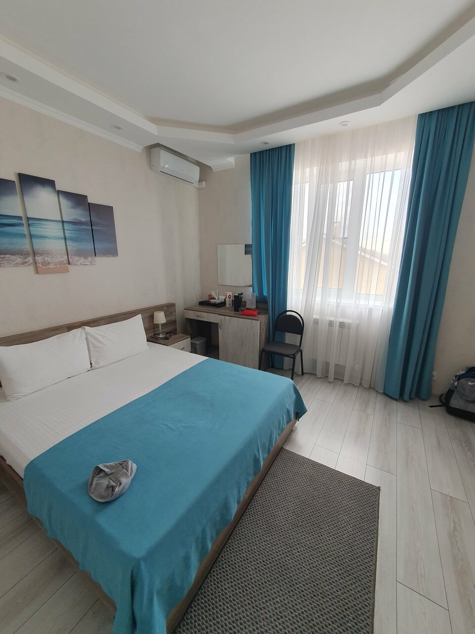 Номера чистые и уютные, большая, удобная кровать, душевая с большой кабиной, не скрипящие двери, все необходимое есть в номере, кулер в коридоре, по желанию можно разогреть еду на кухне, завтраки вкусные, на указаное вами время, есть красивая терраса. Район тихий, находится на горе, вид на горы и город , видно море, в 5 минутах магнит, пятерочка, КБ, до центра 15 минут пешком, до набережной так же.