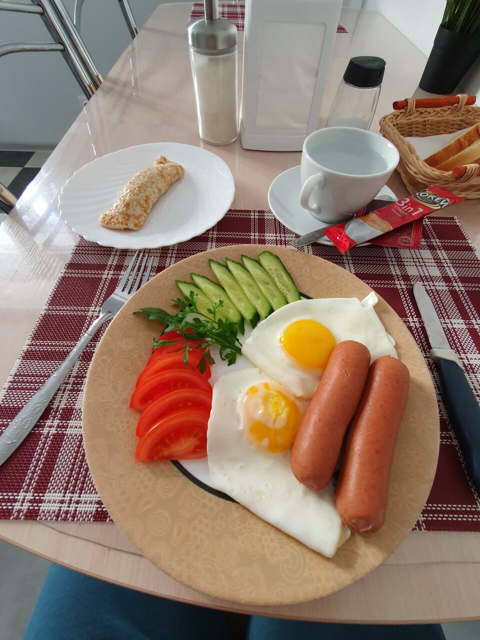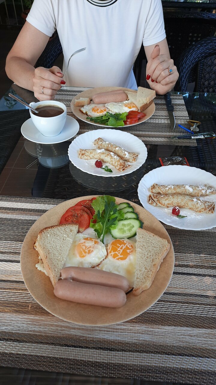 Очень классные номера, чистейшая удобная постель, очень просторно, большая общая кухня. Вечером заказали доставку еды и сидели там. Был красивый вид из окна. Брали завтрак (яичница, две сгсиски, два сладких блинчика и чай/кофе)