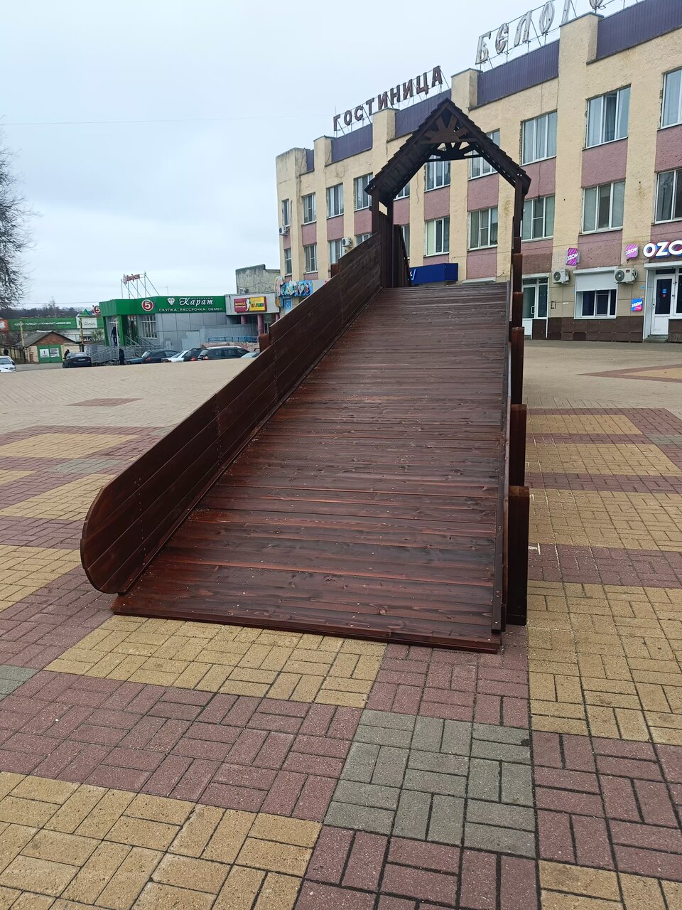 Гостиница в центре города, рядом есть банкоматы, есть магазины ‘Пятерочка’ и другие магазины продовольствия и аптеки. Рядом находится центральная площадь, множество других магазинов и центров. Гостиница обычного города районного центра. Все есть