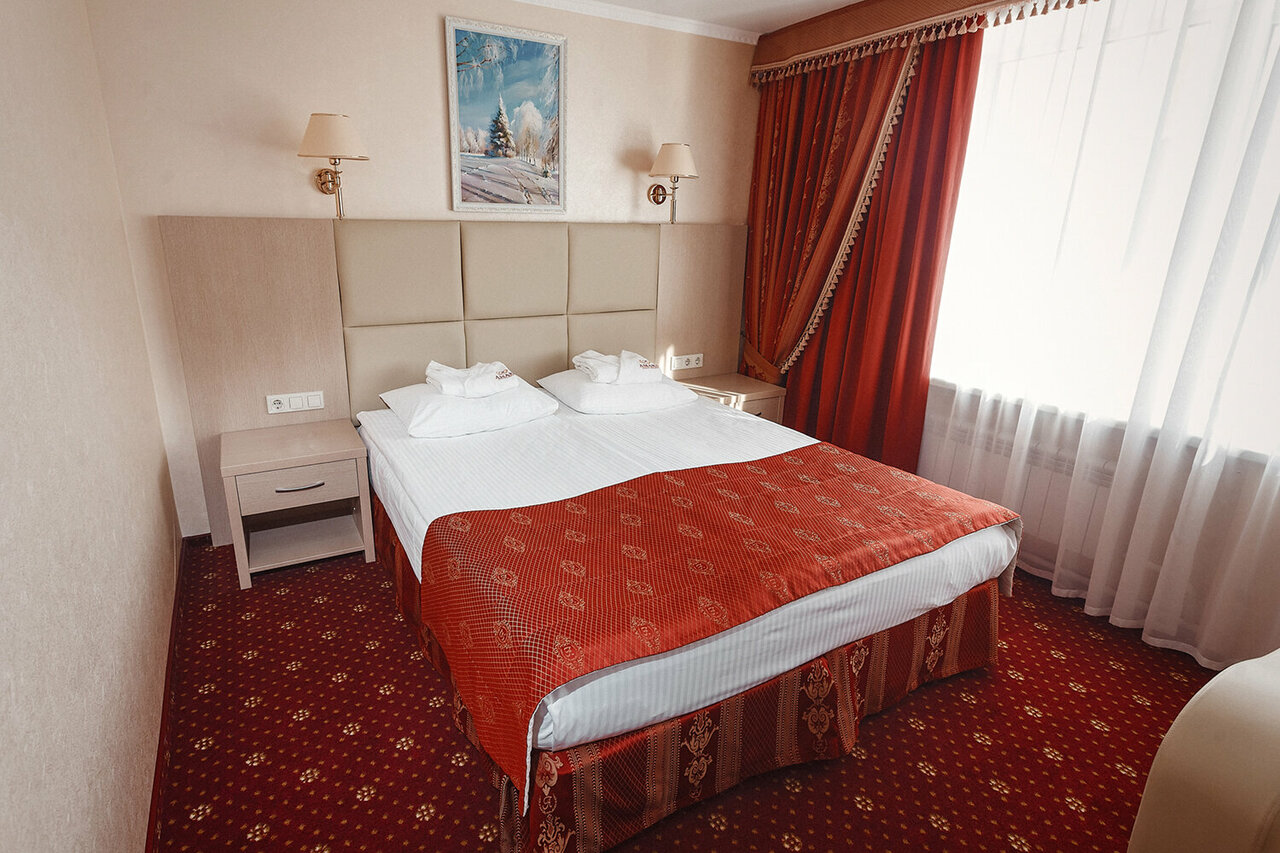 Наверное гостиница с самым большим номерным фондом. Хорошие номера, соответствуют уровню 3-х звезд. Есть кафе. Но очень неудобный заезд.