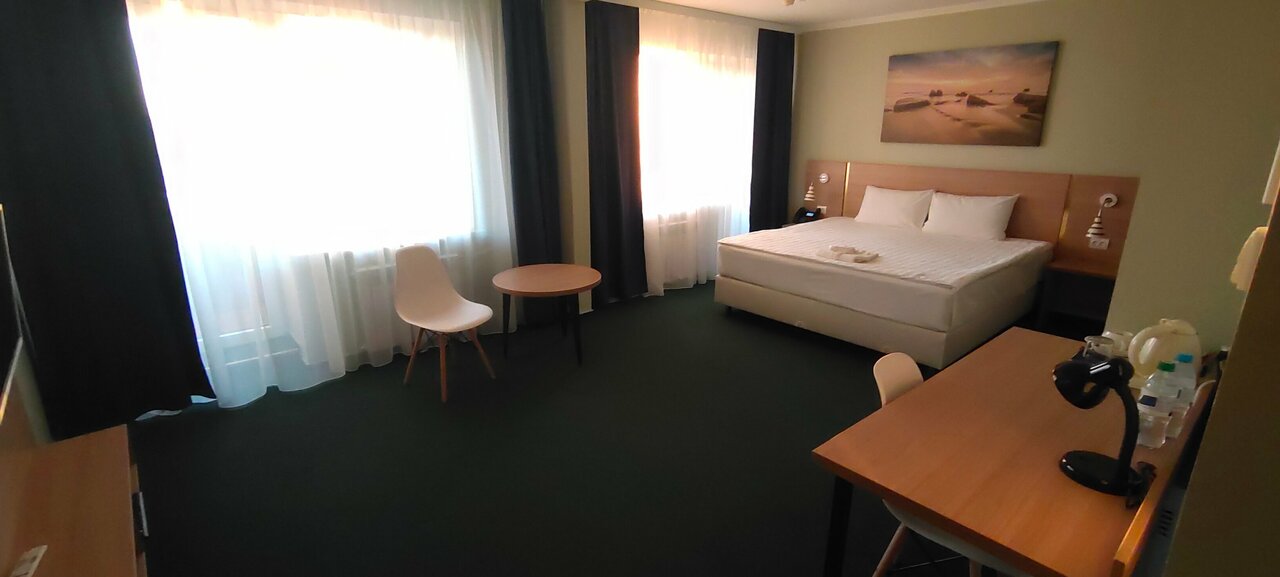 Гостиница очень даже неплохая. Поверьте, я много где бывал в отелях на 3. Всё, что должно быть по сервису ,там есть. Номер светлый, кровать и подушка мягкие. Эргономика номера продумана. Есть большой письменный стол для работ, на котором чайник с набором ‘для гостя’ и дизайнерский холодильник в нише. В прихожей вешалки , что важно для меня. В ванной комнате в душевой хороший напор воды, и причём не надо долго ждать горячую. Единственно ,она вода с неким запахом , но меня это не смущало и волосы не вылезли)). В ванной есть приличный полотенцесушитель.На ресепшене и в столовой персонал вежлив и предупредителен. Едой, предлагаемой на завтрак, при его включении в стоимость номера, вполне можно насытиться. А так, сама столовая работает до вечера. Нехватило вот что: стойки для душевой лейки, дезодоранта у туалета, светильников над кроватью (для чтения книг) и расписание автобусов(ведь до остановки 10 минут идти).