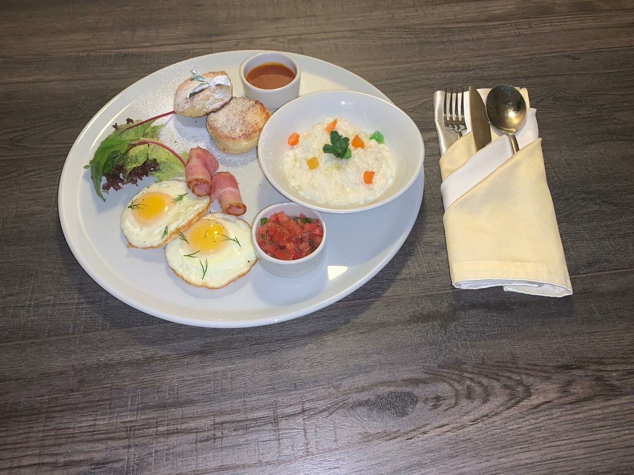 Номер очень просторный. Завтрак — НЕ шведский стол: девушка выносит тарелку со стандарным набором еды — каша, масло, сыр мясная нарезка. На выбор — чай или кофе.