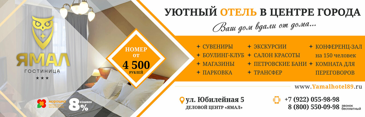 Контакты: — Сайт: yamalhotel89.ru — Телефоны: 8 (800) 550-09-98 (бесплатно), +7 (922) 055-98-98, +7 (3494) 93-98-98