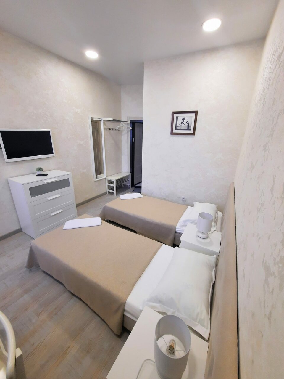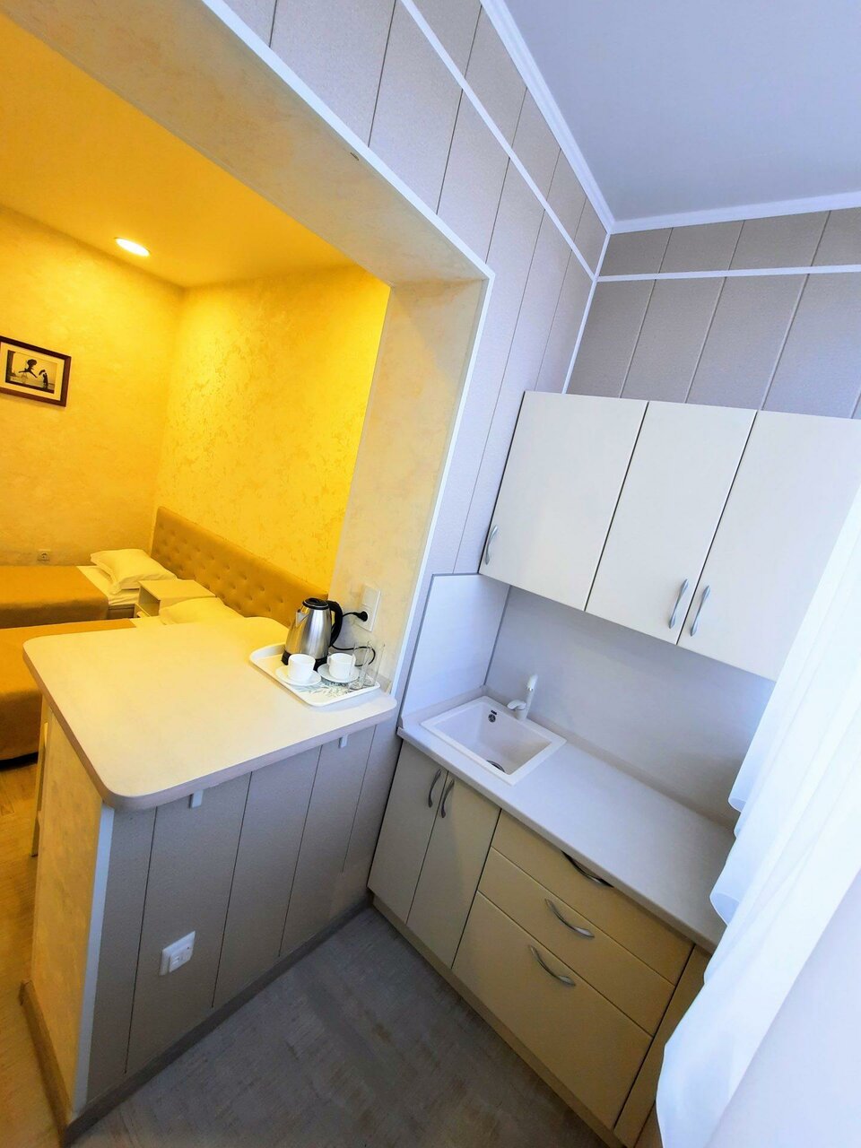 Есть возможность бесконтактного заселения, свежий ремонт и очень отзывчивый персонал:) Есть кулер с горячей/холодной водой и чай в лобби. Сам номер просторный, нам очень понравился