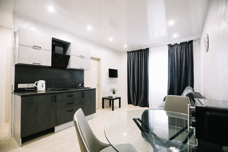 Очень доволен проживанием в апартаментах. Нет никаких пыльных ковров, чистая мебель, бытовая техника, сантехника. Мебель в отличном состоянии. Есть телевизор с КиноПоиском и ОККО.