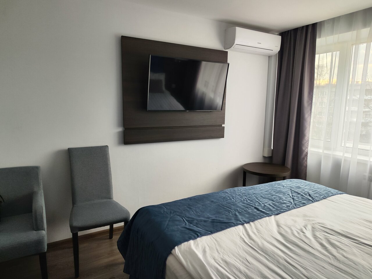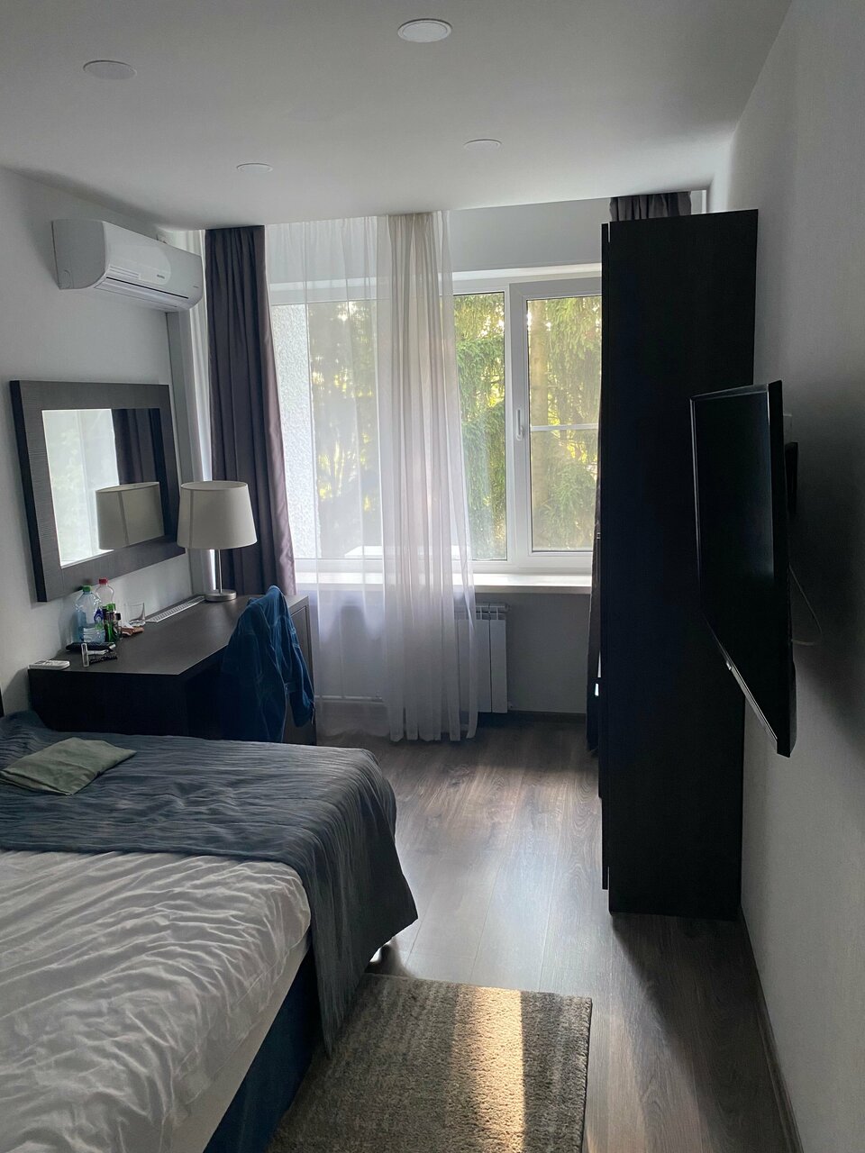 Комфортная комната на 2-3 человека. 1 двуспальная и 1 односпальная кровати, шкаф, тумба, холодильник, чайник, посуда, кондиционер, телевизор, WiFi, фенПолноценная ванная комната совмещённая с туалетомКомната светлая, так как есть два окна.