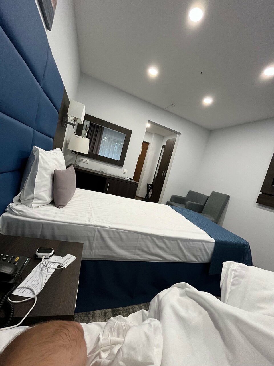 Сама гостиница выглядит шикарно. Пропускная система . На ресепшене недоброжелательные администраторы. Завтра вкусный- это самый огромный плюс этой гостиницы. Номер сам чистый, новая мебель , но расстроили следующие моменты: - в номере нет бутилированной воды и чайника, до кулера идти очень далеко, с горячей водой не находишься. В ванной просто мрак. Туалет с желтыми полосами( купите соляную кислоту и это всё отмоется) душевая кабина вся по швам желтая, отдельного полотенца для Пола не дают, выходишь- очень скользко, раковина очень маленькая. Тапок одноразовых нет. Пододеяльник был в каких-то синих пятнах. Одна маленькая мусорка в ванной. Мебель придвинута очень близко друг к другу, не смогли открыть холодильник. В общем не очень хорошее впечатление осталось